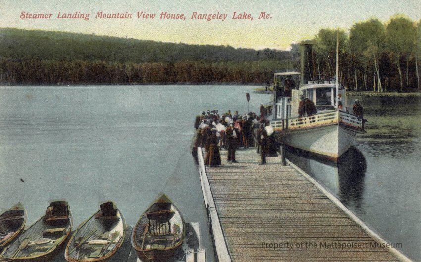 Hand-colored postcard showing Steamer Landing Mountain View House, Rangeley Lake, Maine. Hand-written note to Mrs. O. H. Purrington, Mattapoisett, Mass. Postmarked from Mountainview, Maine on July 17, 1908.Collection