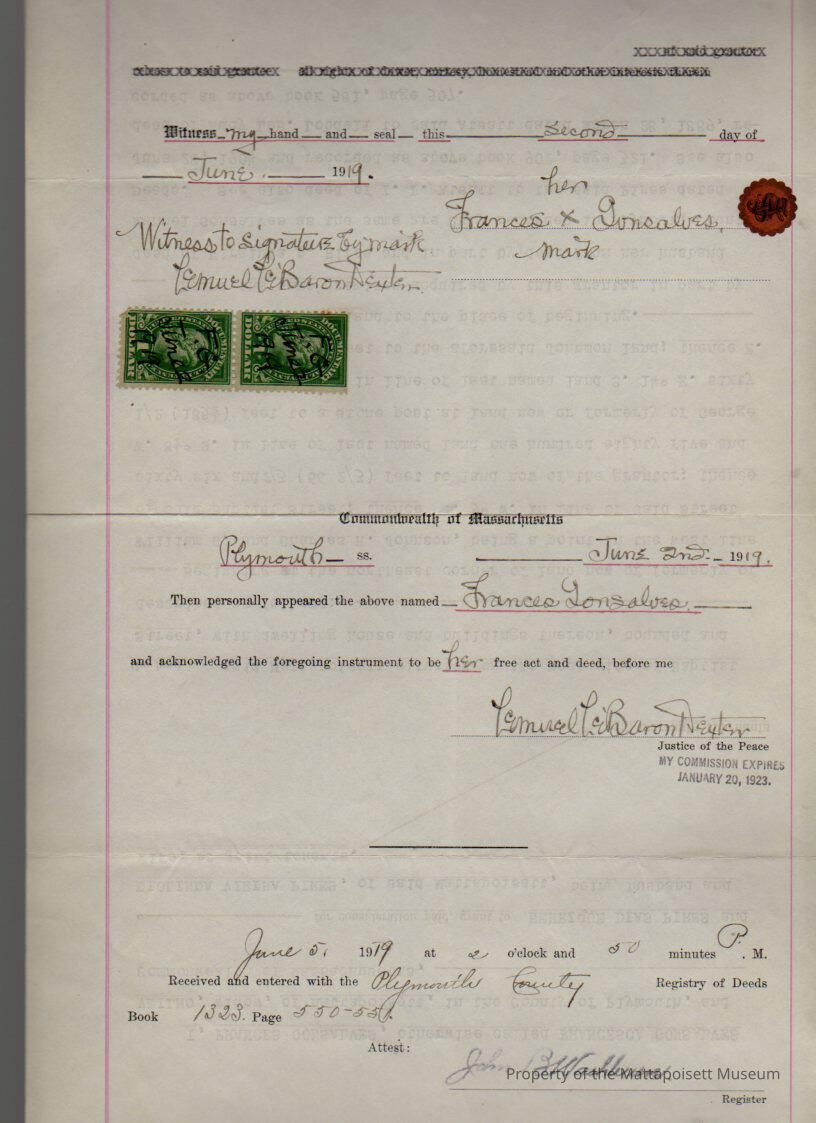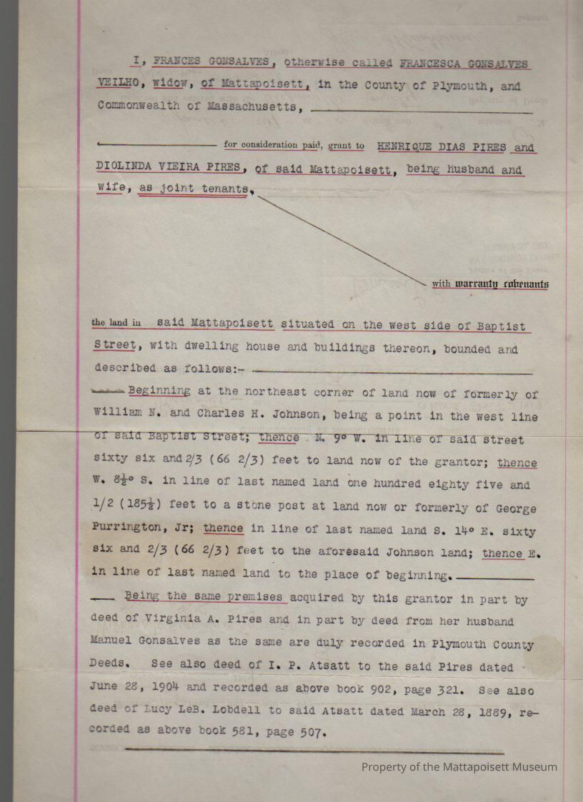 Frances Gonsalves to Henrique Dias & Diolinda Vieira Pires, land on west side of Baptist Street with dwelling house and buildings.Collection
