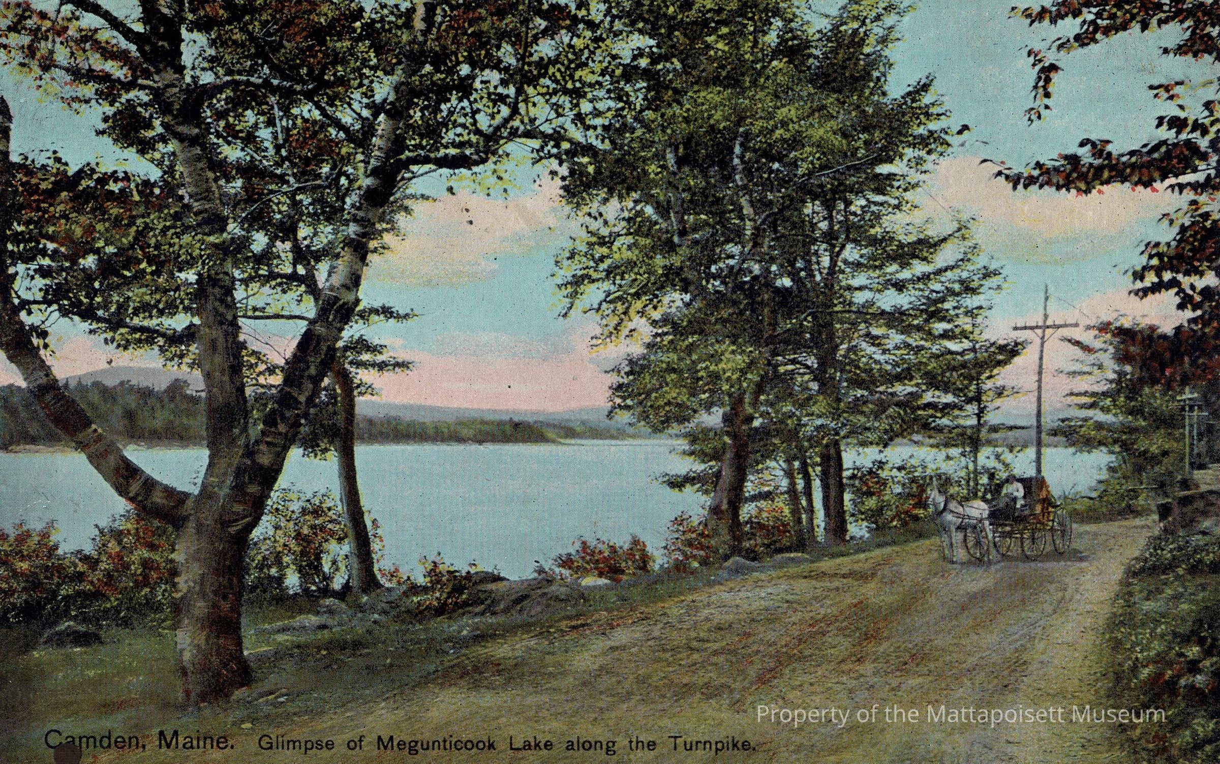 Hand-colored postcard showing Camden, Maine. Glimpse of Megunticook Lake along the Turnpike. Handwritten note to Mrs. G. Purrington, Mattapoisett, Mass. Postmark not legible.Collection