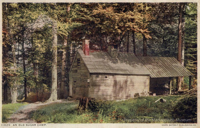 Hand-colored postcard showing An Old Sugar Camp. Handwritten note to Mrs. George Purrington, Mattapoisett, Mass. Postmark not legible.Collection