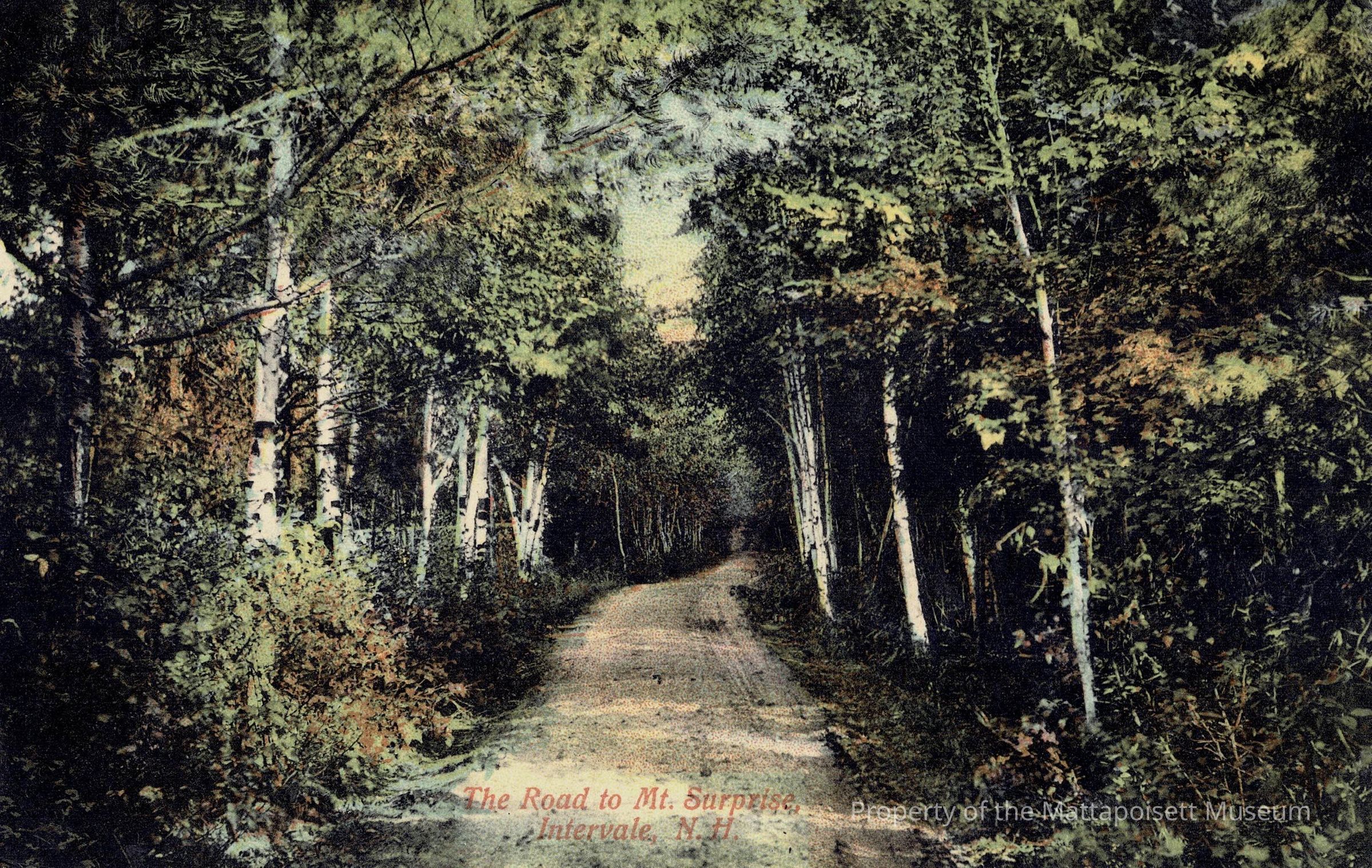 Hand-colored postcard showing The Road to Mt. Surprise, Intervale, N.H. Handwritten note to Mrs. George F. Purrington, Main Street, Mattapoisett, Massachusetts. Postmarked from Intervale, N.H. on August 17, 1908.Collection