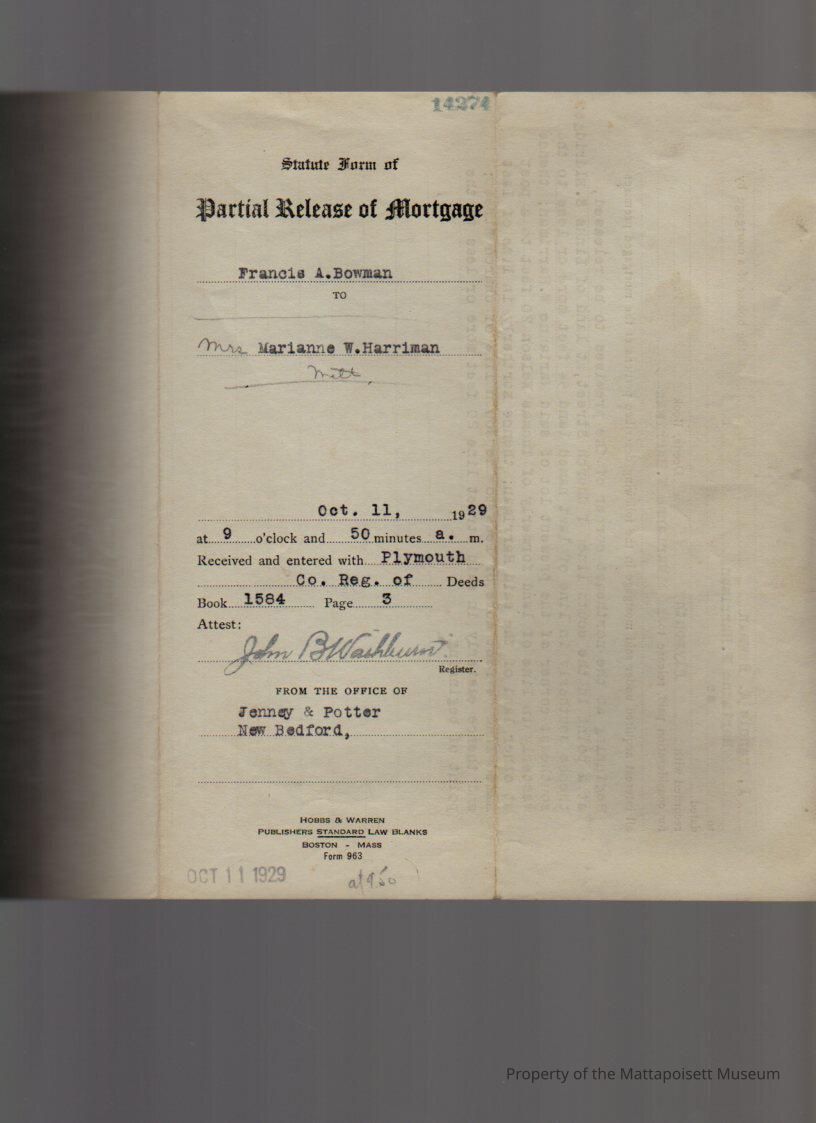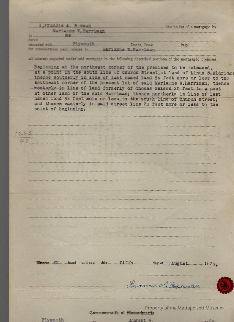 Francis A. Bowman, mortgage to Marianne W. Harriman, land at Church Street.Collection