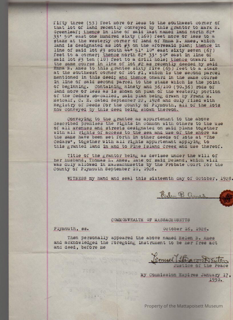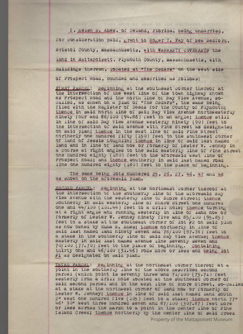 Helen B. Ames of Deland FL to Roger T. Fay of New Bedford, land and buildings located at the "Cedars", several parcels on the west side of Prospect Road.Collection