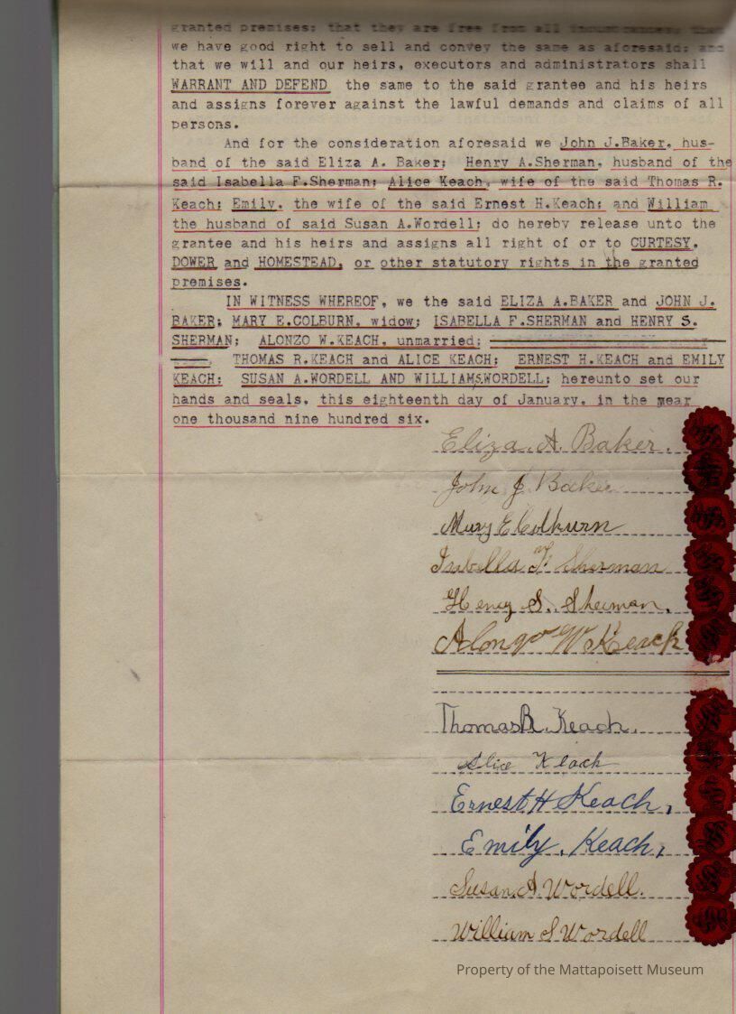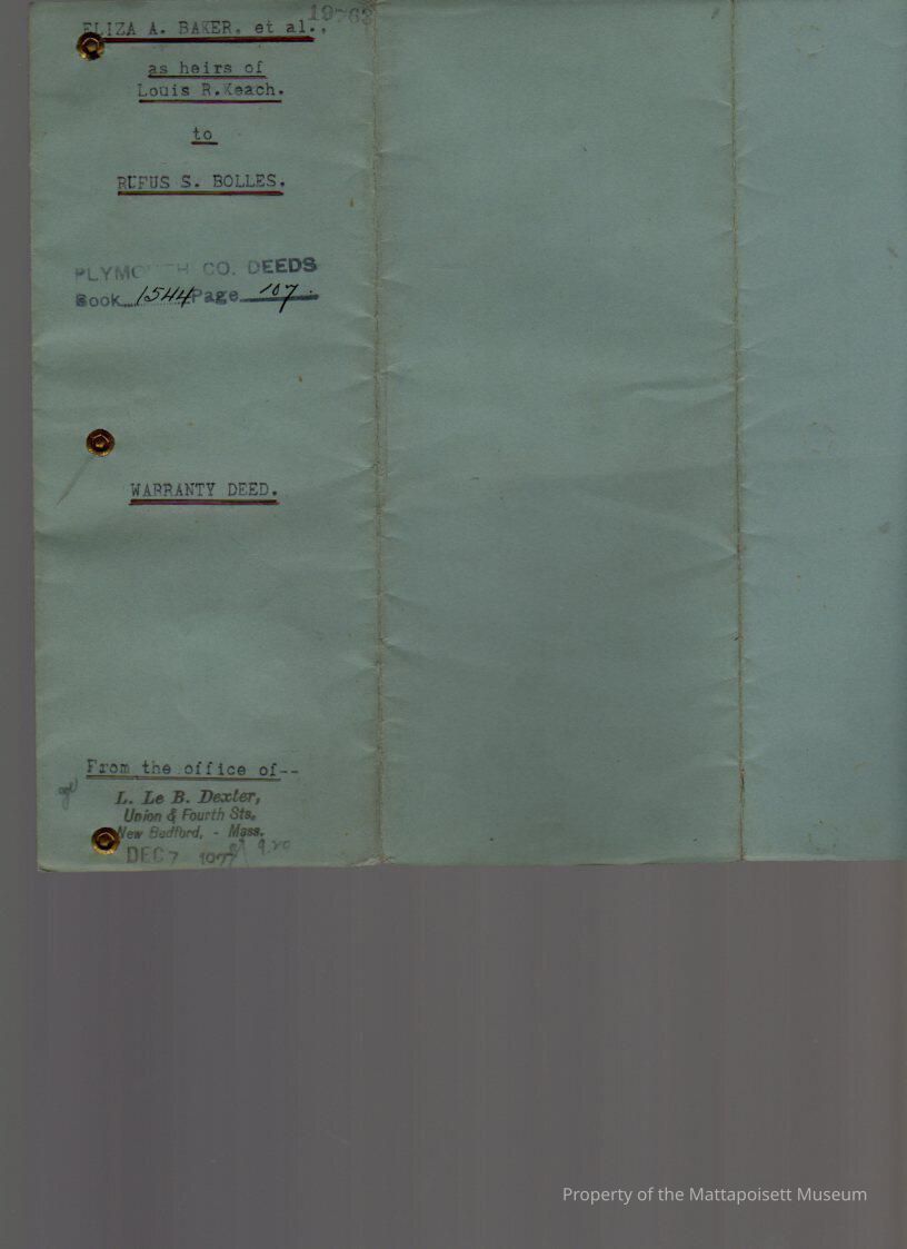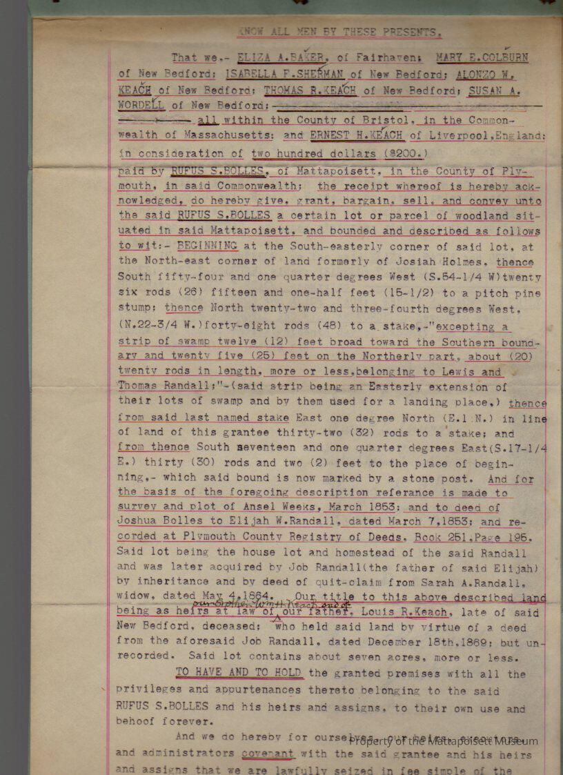 Heirs of Louis R. Keach, Eliza A. & John J. Baker, Mary E. Colburn, Isabella F. & Henry S. Sherman, Alonzo W. Keach, Thomas R. & Alice Keach, Ernest H. & Emily Keach and Susan A. & William S. Wordell to Rufus S. Bolles, 7 acres woodland in Mattapoisett for $200.Collection