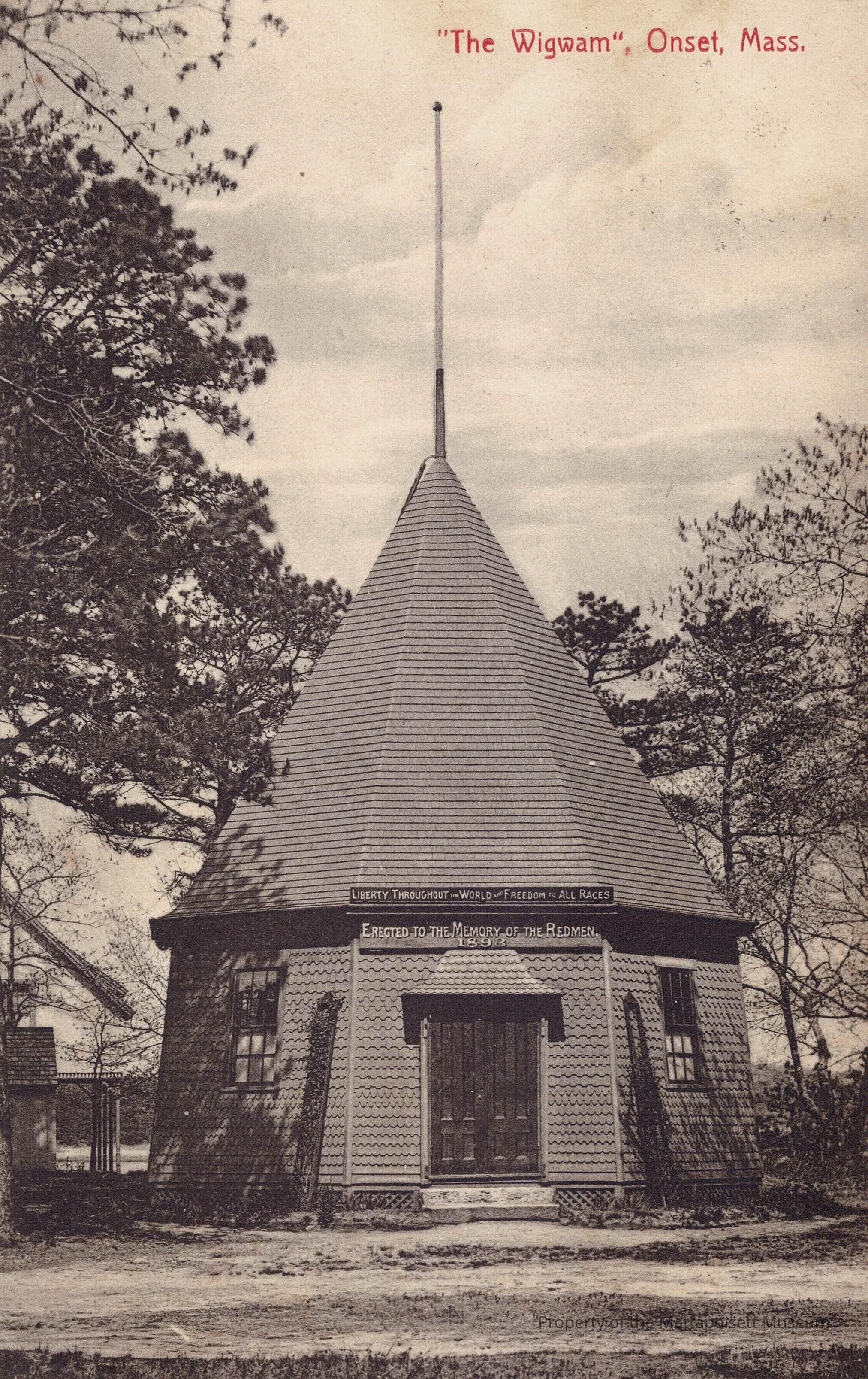 Black and white postcard showing "The Wigwam", Onset, Mass. Handwritten note from Ruth to Miss Florence Purrington, Mattapoisett, Mass. Postmarked from Onset, Mass. on September 22, 1908.Collection