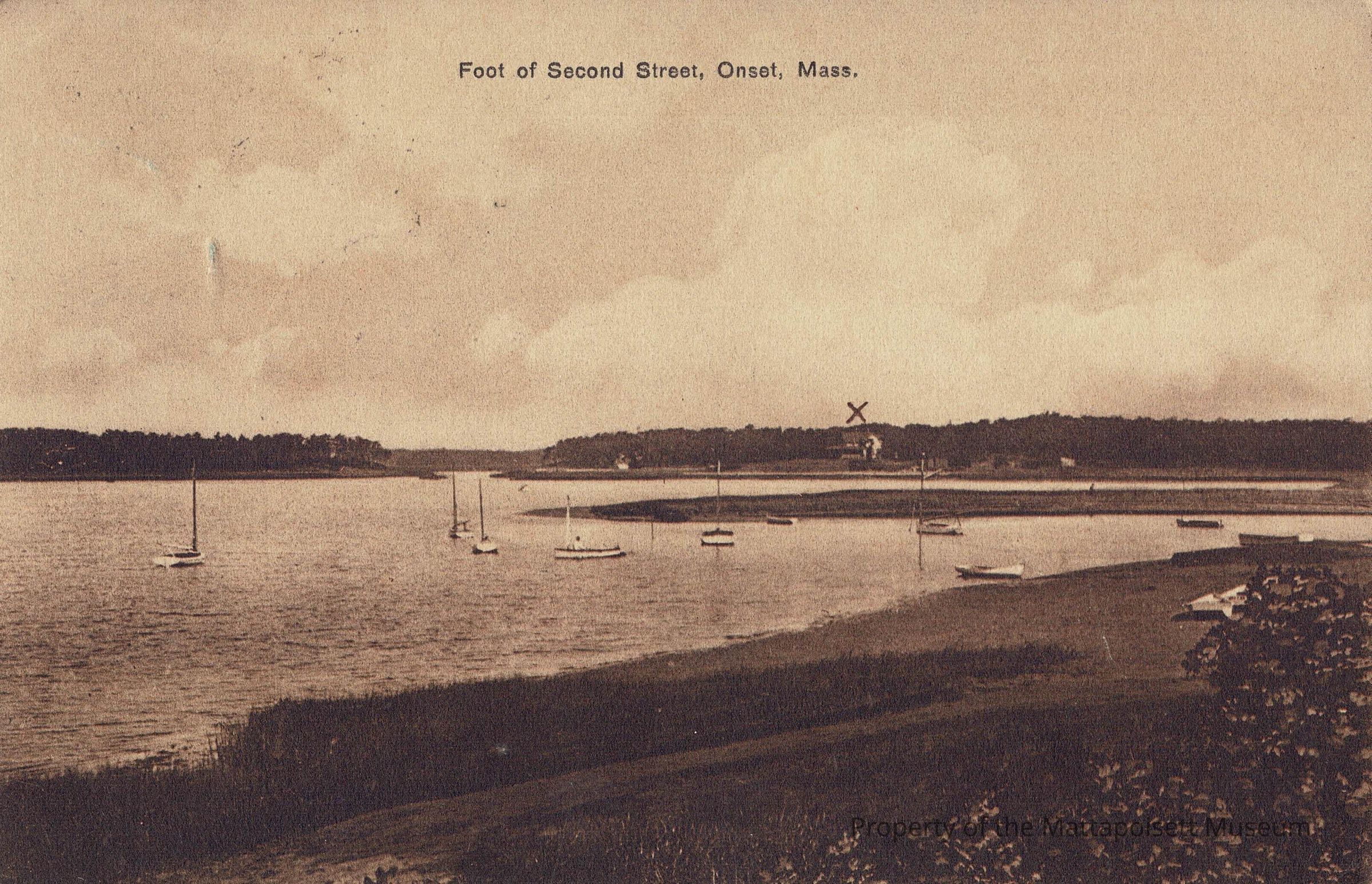 Sepia toned postcard showing Foot of Second Street, Onset, Mass. Handwritten note from Ruth to Miss Florence Purrington, Mattapoisett, Massachusetts. Postmarked from Onset, Mass. on August 11, 1908.Collection