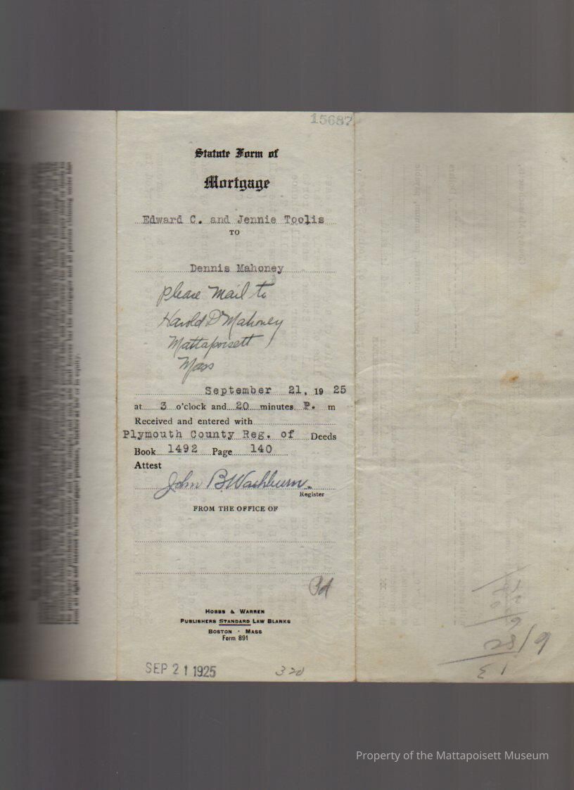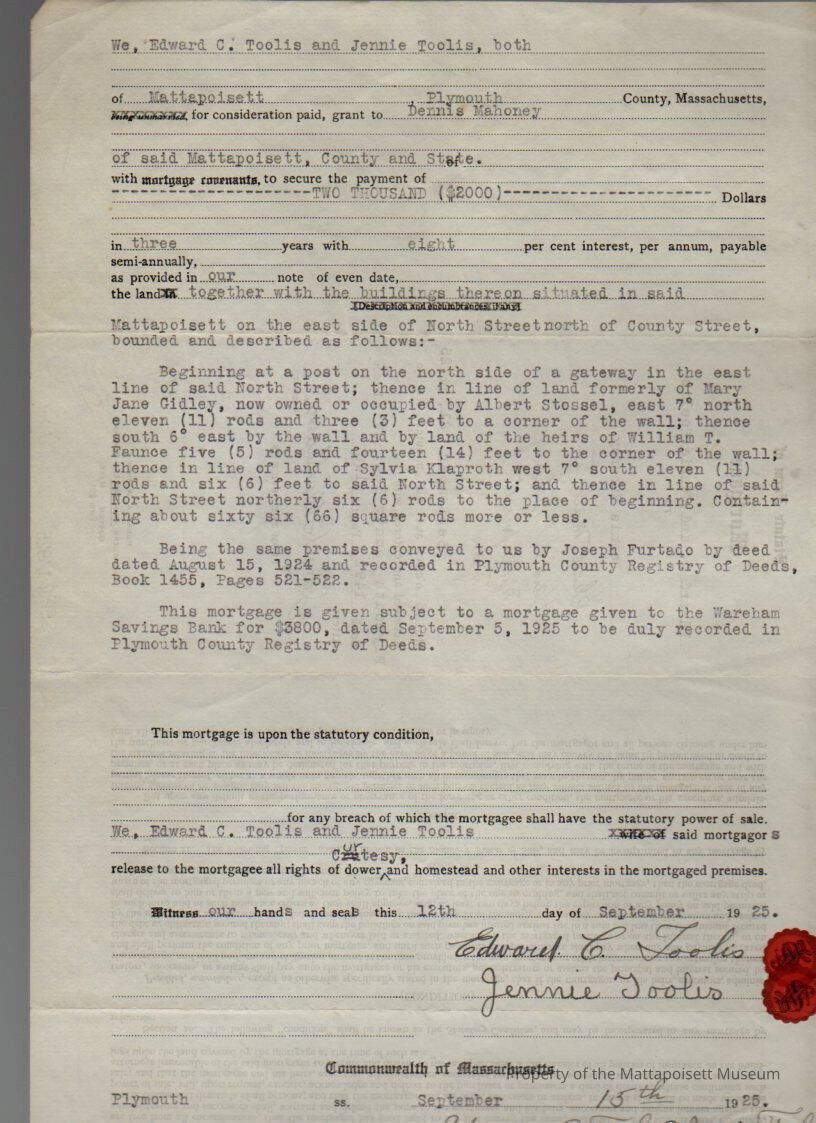 Edward C. & Jennie Toolis to Dennis Mahoney, 66 sq. rods land and buildings on the east side of North Street, north of County Street for $2,000 over 3 years.Collection