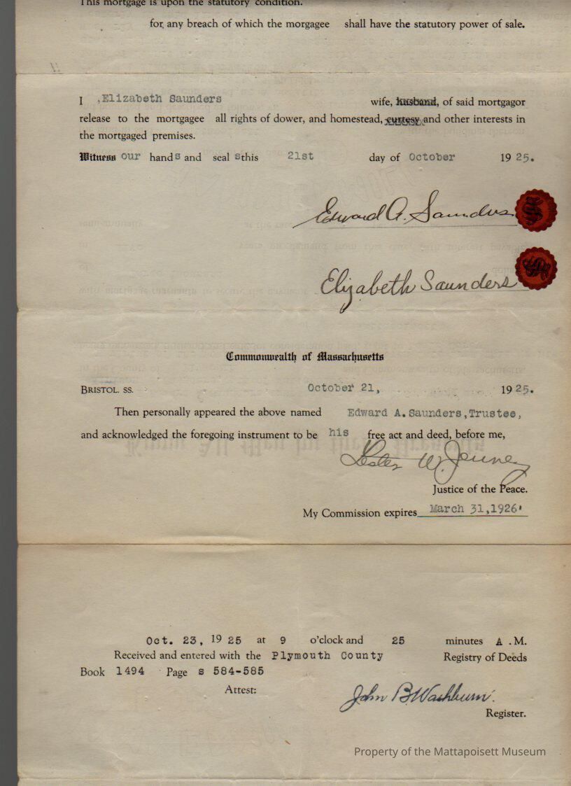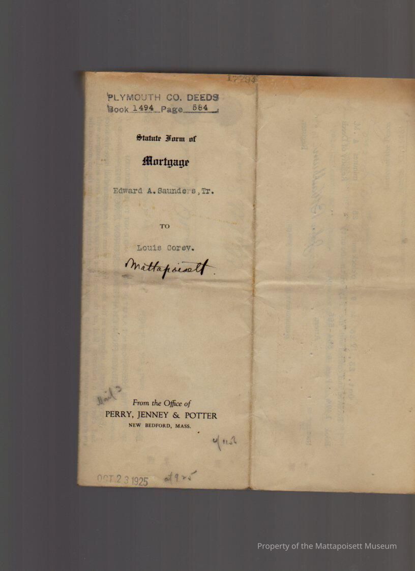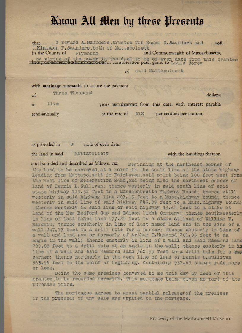 Edward A. Saunders, trustee for Roger C. Saunders and Kinison F. Saunders and Elizabeth Saunders to Louis Corey, 937.63 sq. rods land on highway between Mattapoisett and Fairhaven for $3,000 over 5 years.Collection