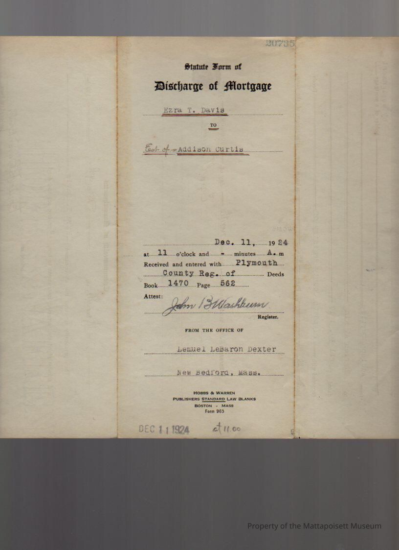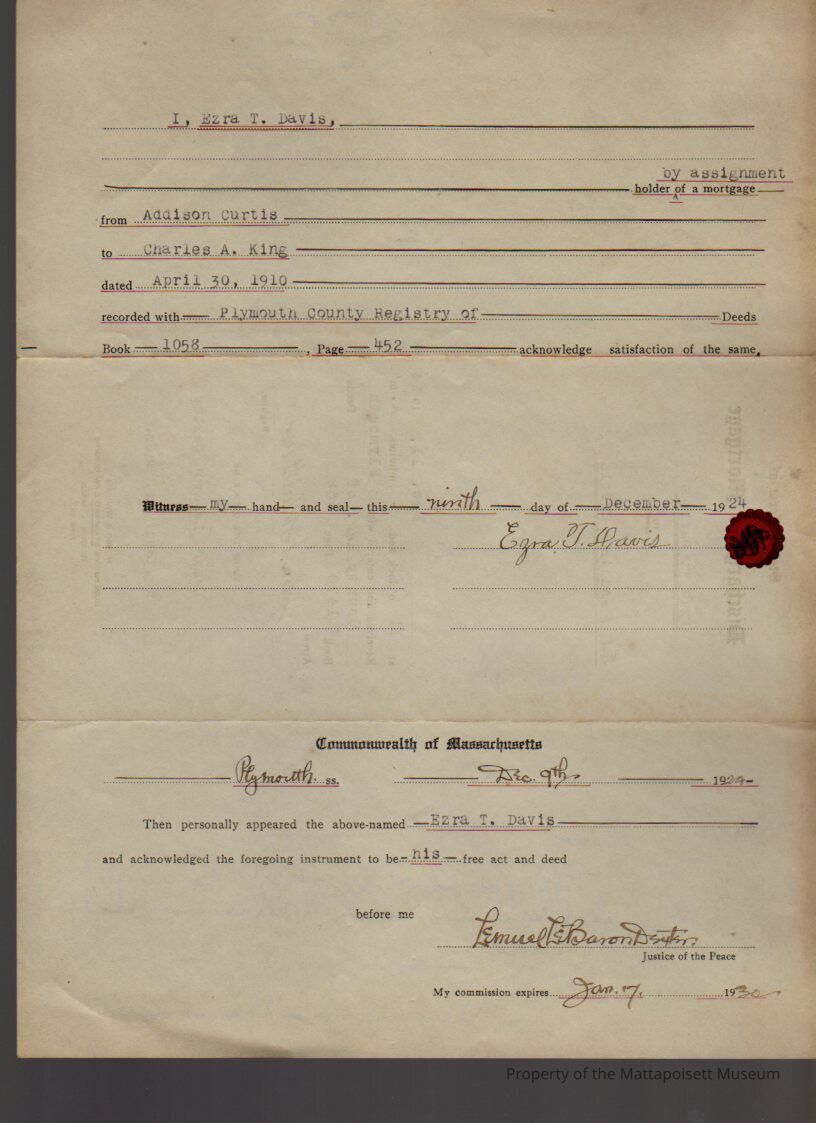 Ezra T. Davis, holder by assignment of a mortgage from Addison Curtis to Charles A. King, dated April 30, 1910, discharge.Collection