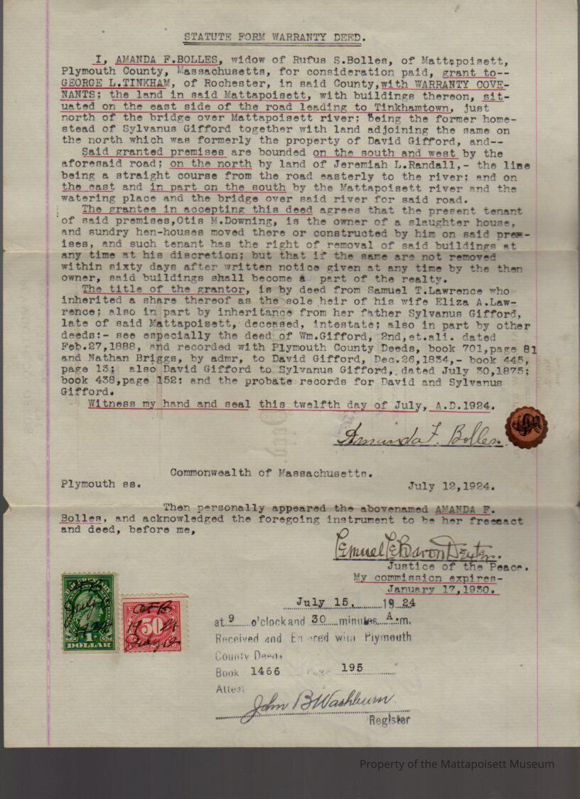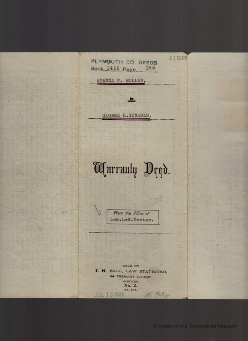 Amanda F. Bolles, widow of Rufus S. Bolles to George L. Tinkham, land and buildings on the east side of the road to Tinkhamtown, north of the bridge over Mattapoisett River.Collection