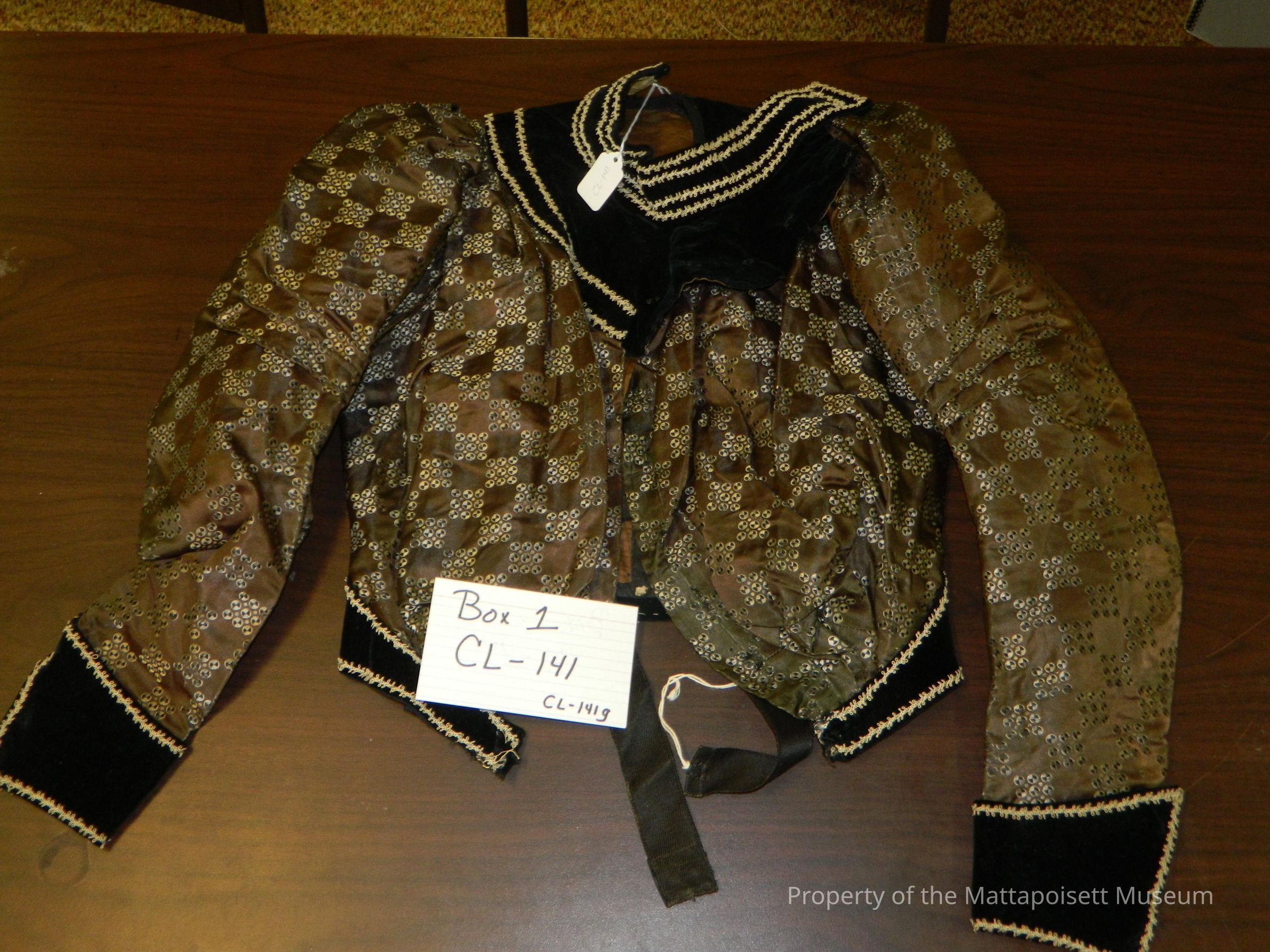 brown patterned satin bolero jacket. reinforced boned darts to bustline. lambs wool shoulder padding . black velvet mandarin collar. black velvet band at waist. large pointed black velvet cuffs. all black velvet has tatting outline.Collection