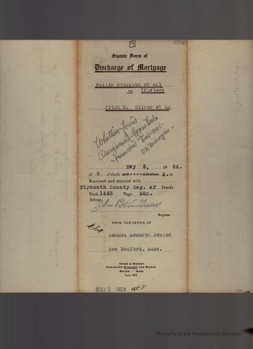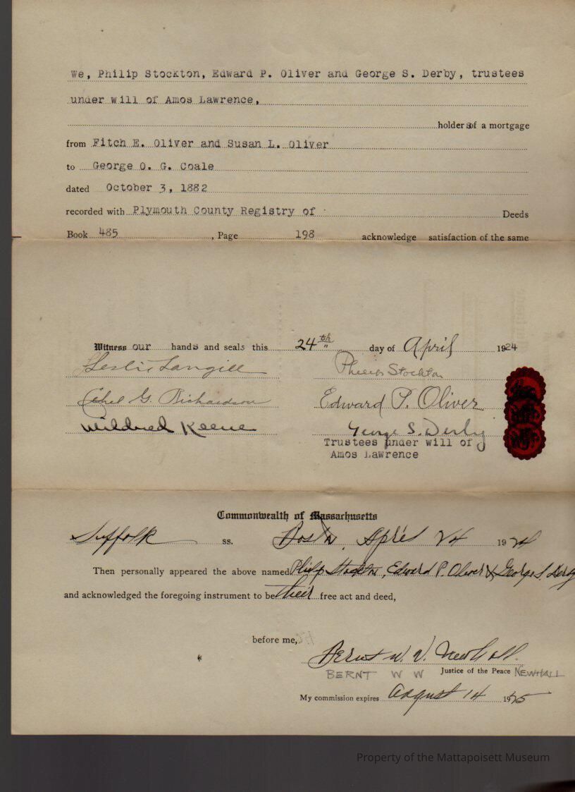 Philip Stockton, Edward P. Oliver and George S. Derby, trustees under the will of Amos Lawrence, holder of a mortgage from Fitch E. Oliver and Susan L. Oliver to George O. G. Coale dated October 3, 1882.Collection