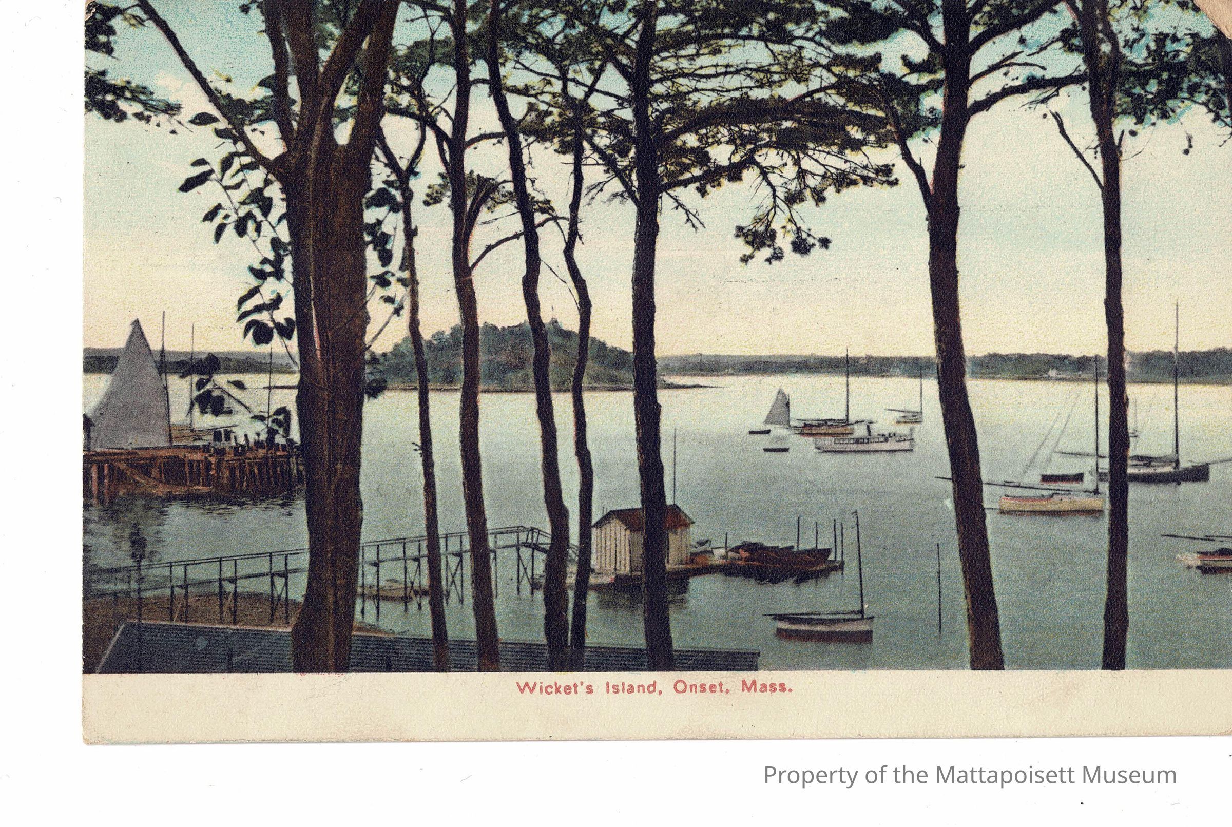 Hand-colored postcard showing Wicket's Island, Onset, Mass. Handwritten note from Ruth Griffin to Miss Florence Purrington, Mattapoisett, Mass. Postmarked from Onset, Mass. on August 18, 1936.Collection