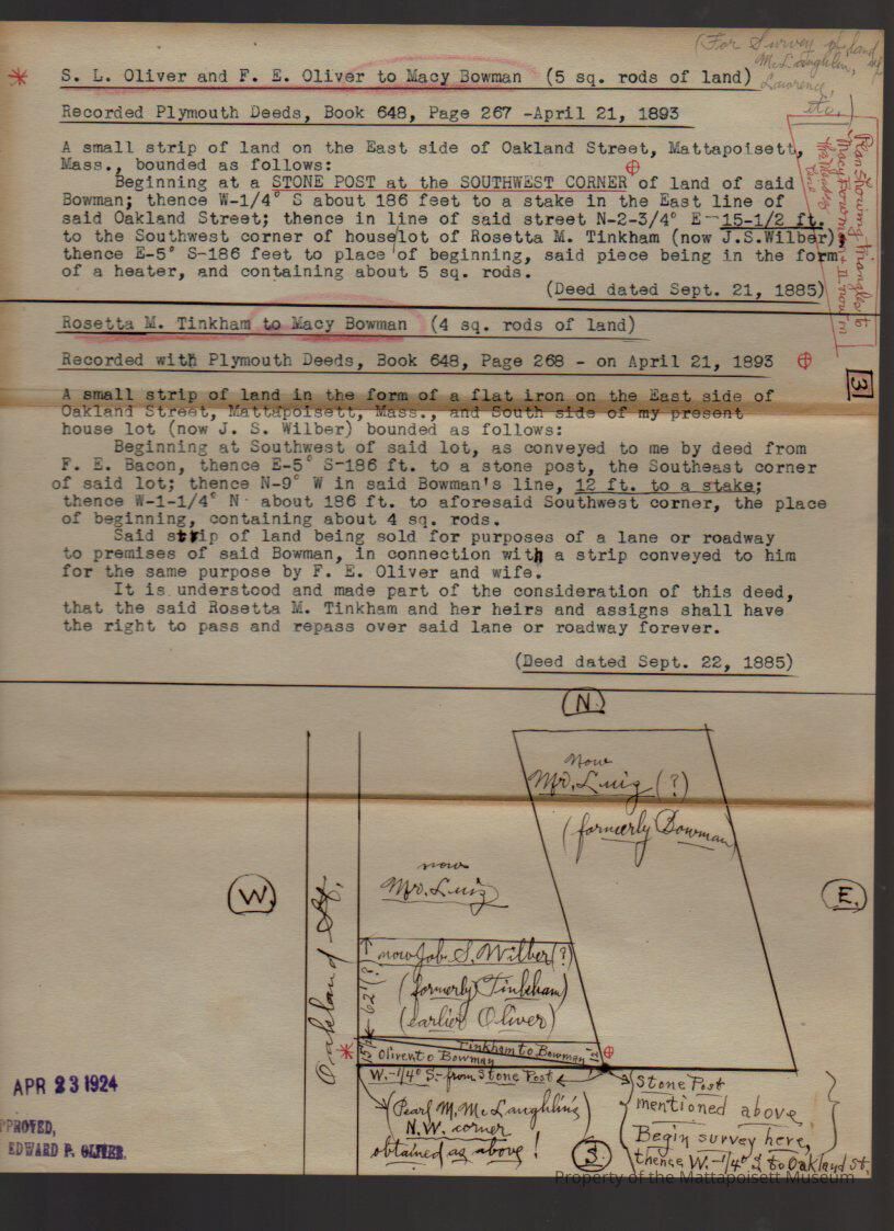 Descriptions of two parcels of real estate. S. L. & F. E. Oliver to Macy Bowman, 5 sq. rod strip on east side of Oakland Street, dated Sept. 21, 1885 and Rosetta M. Tinkham to Macy Bowman, 4 sq. rod land on the east side of Oakland Street dated Sept. 22, 1885. Drawings.Collection
