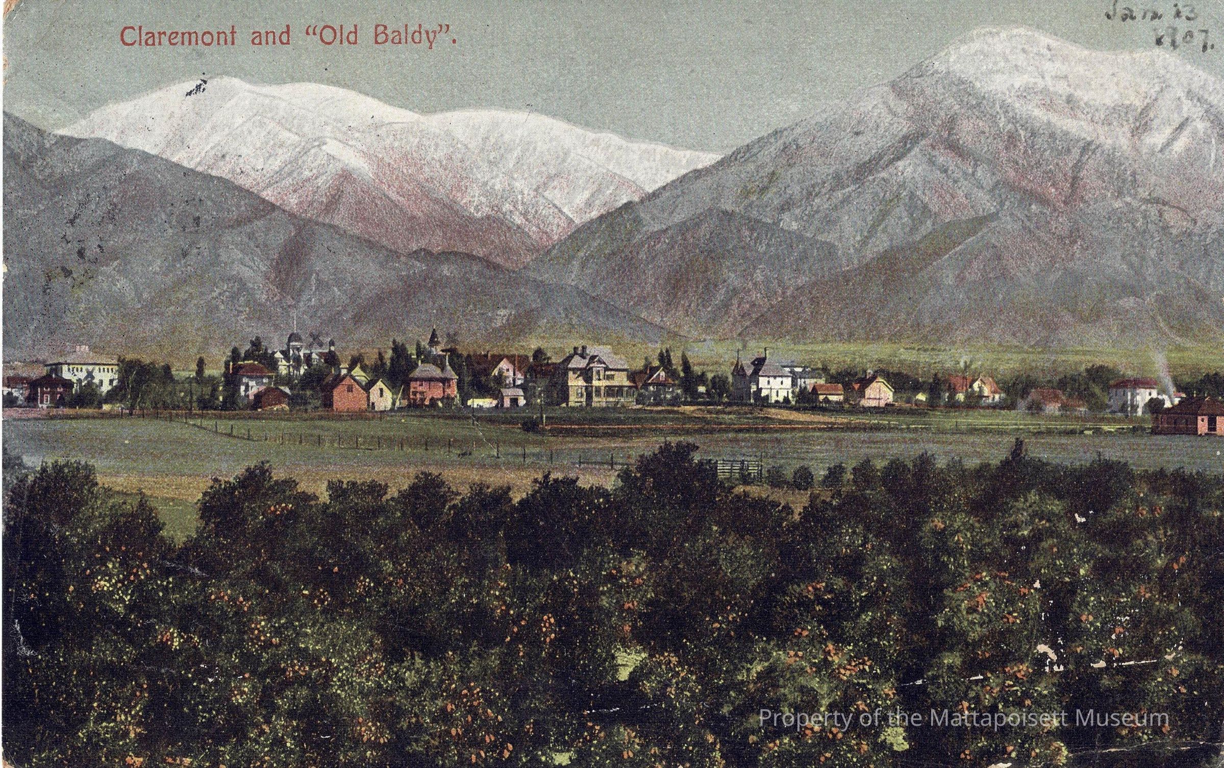 Hand-colored postcard showing Claremont and "Old Baldy". Postcard sent to Mrs. George Purrington, Mattapoisett, Massachusetts from M.L. Atsatt, Pomona College, Claremont, California. Postmarked from Claremont, Callifornia January 14, 1907 and postmarked upon arrival to Mattapoisett on January 19, 1907.Collection