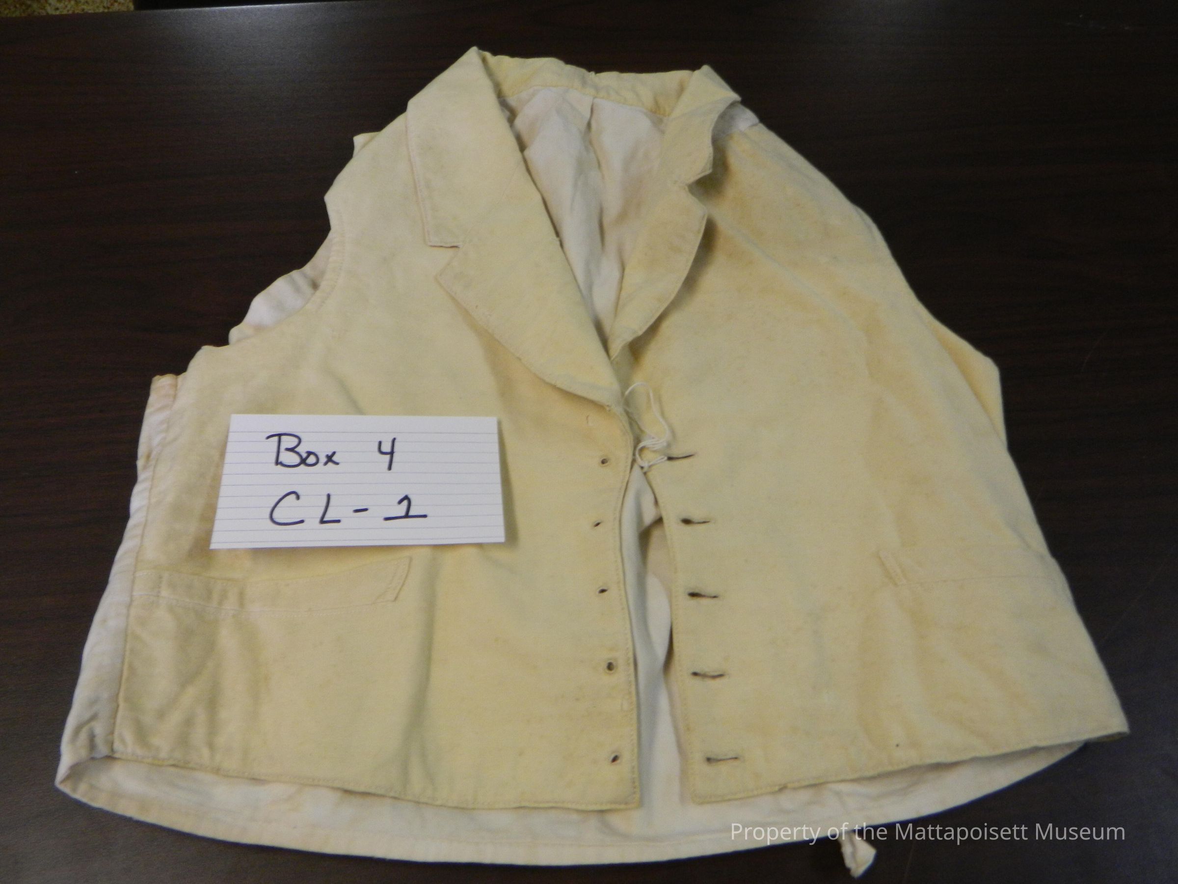 Notes: Notecard: Chamois vest. With pockets, used for carrying gold nuggets. Worn by Joseph Bolles 1849.Created By