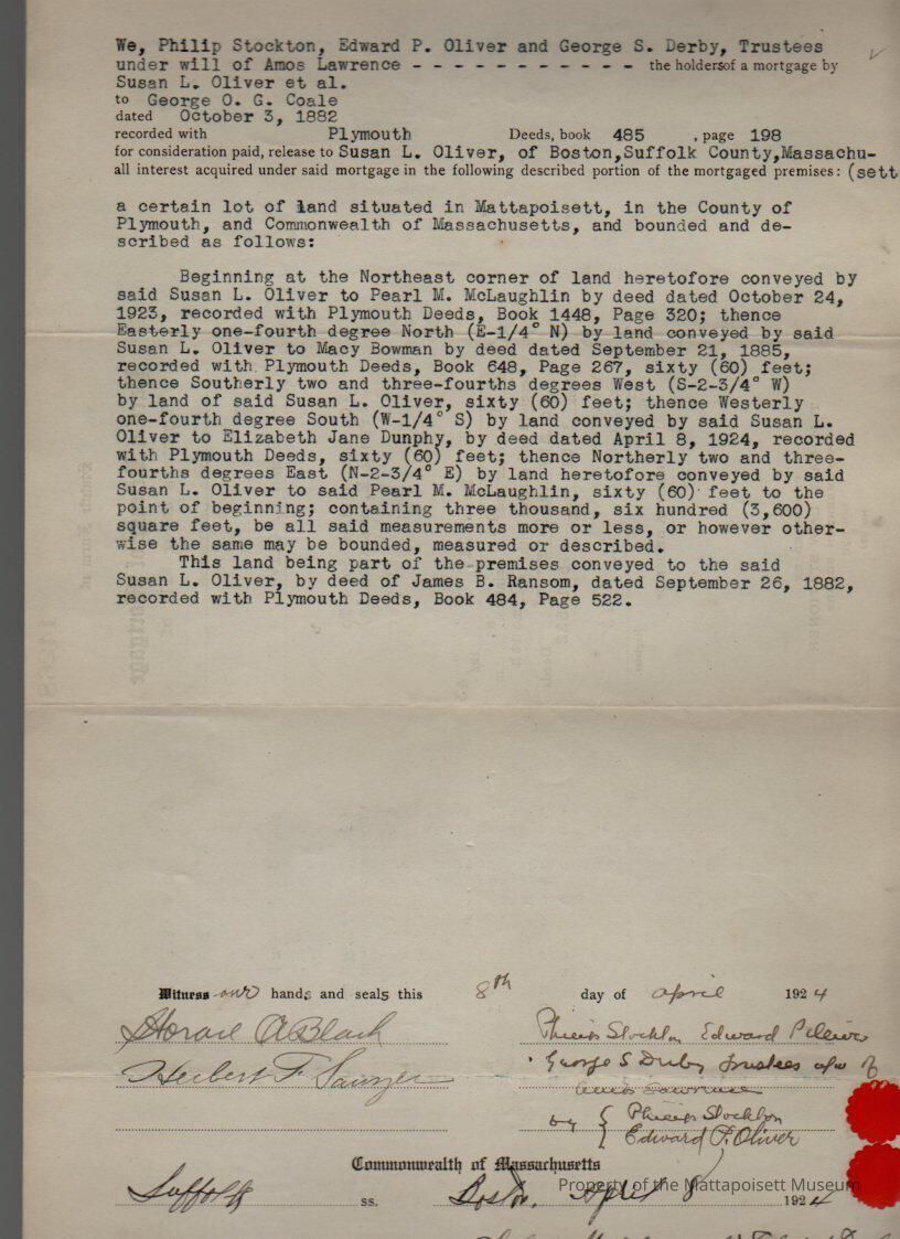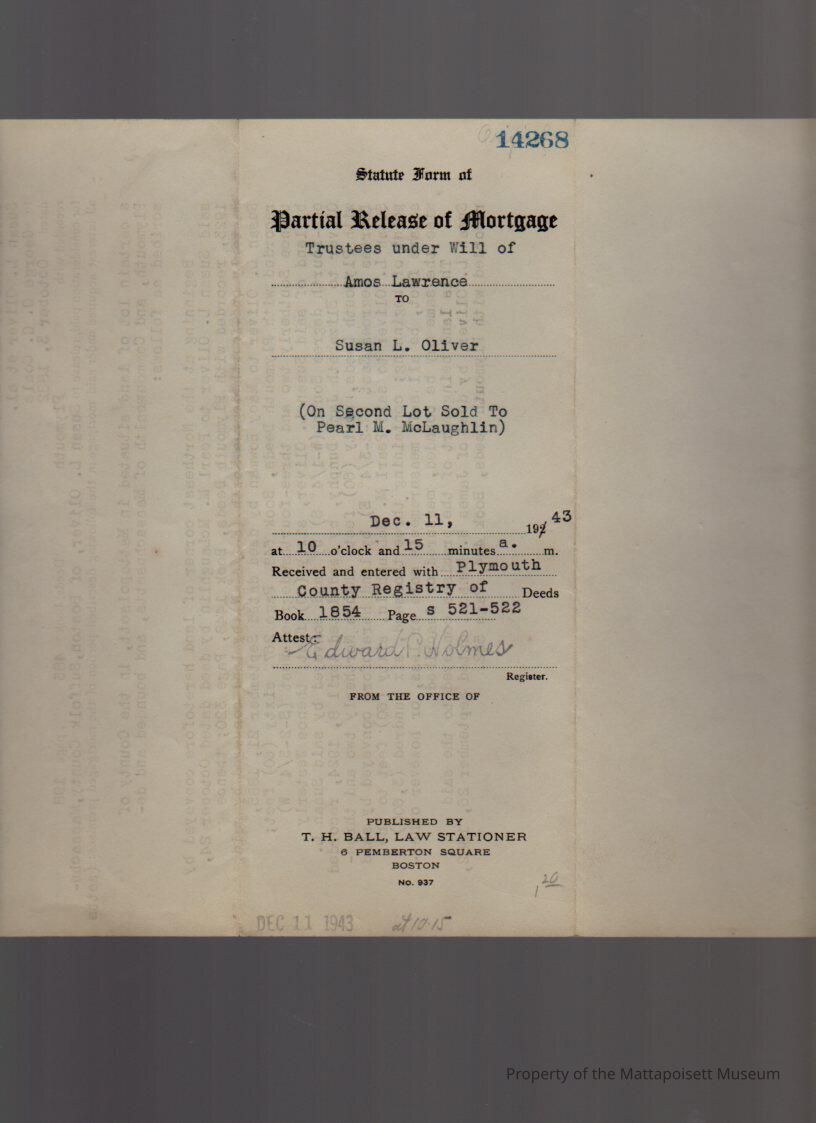 Philip Stockton, Edward P. Oliver and George S. Derby, trustees under the will of Amos Lawrence, holder of a mortgage by Susan L. Oliver et al. to George O. G. Coale, 3,600 sq. ft. land.Collection