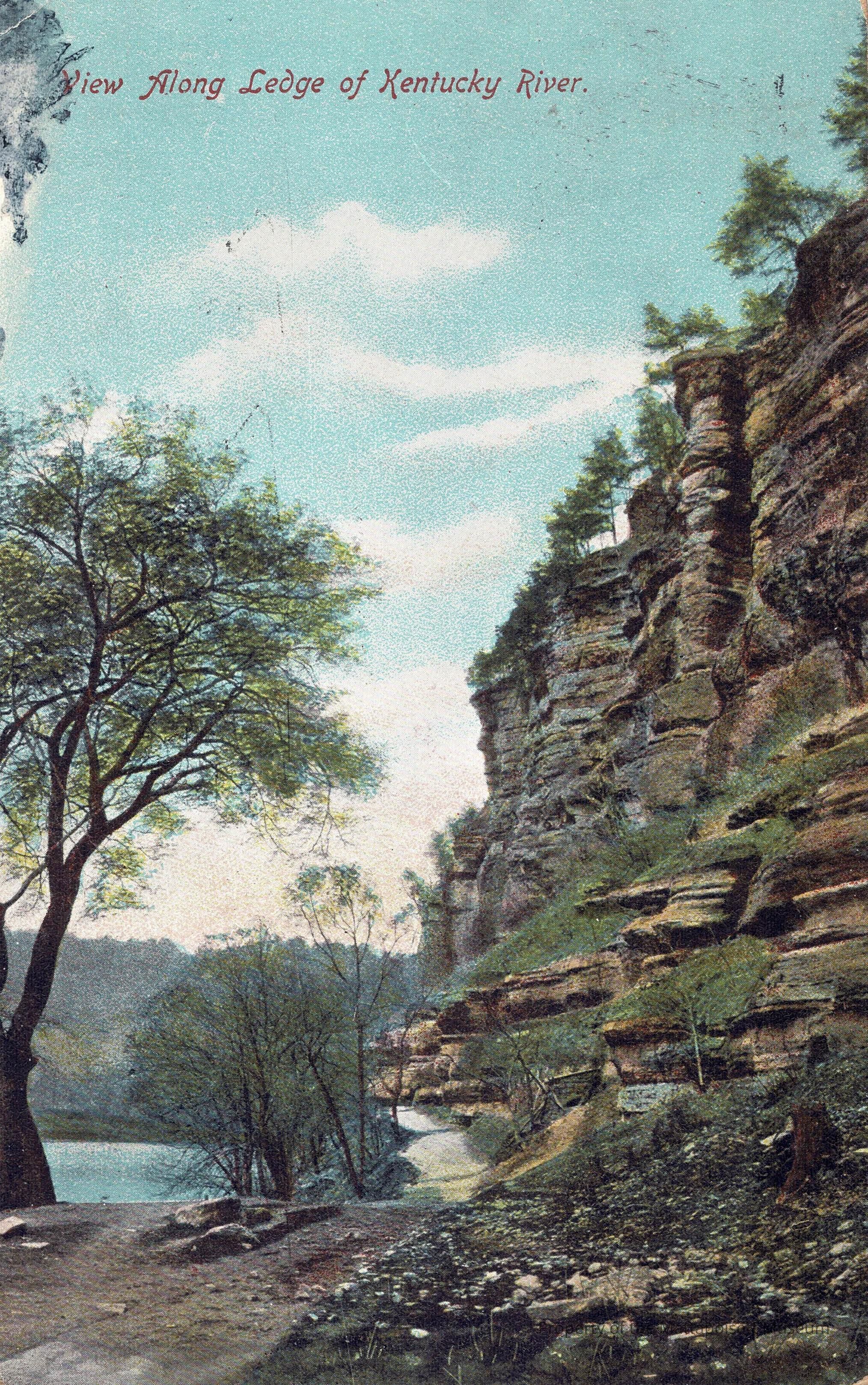 Hand-colored postcard showing a View Along Ledge of Kentucky River. Handwritten note to Mrs. O.H. Purrington, Mattapoisett, Massachusetts. Postmarked from Richmond, Kentucky on November 25, 1908. Postmarked date not legibile but content of note states "18 years ago in 1890" which appears to be 1908.Collection