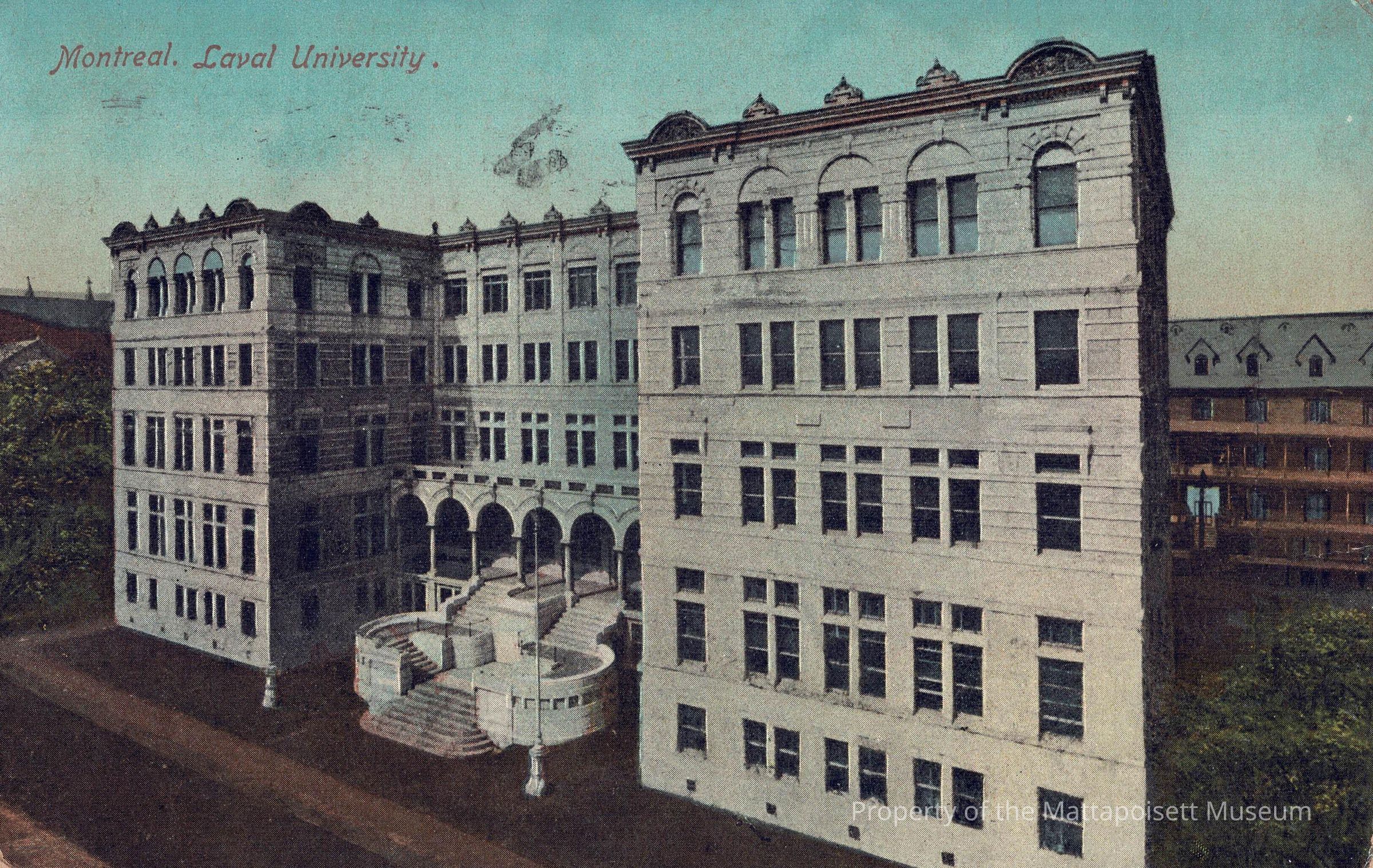 Hand-colored postcard showing Montreal, Laval University. Handwritten note to Mrs. George Purrington, Mattapoisett, Mass. USA. Postmarked from Montreal, Canada on June (date not legible), 1912.Collection