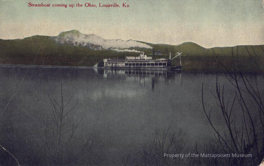 Hand-colored postcard showing Steamboat coming up the Ohio, Louisville, KY. Handwritten note to Mr. George Purrington, Mattapoisett, Massachusetts. Postmarked from Louisville, Kentucky on April 7, 1910.Collection