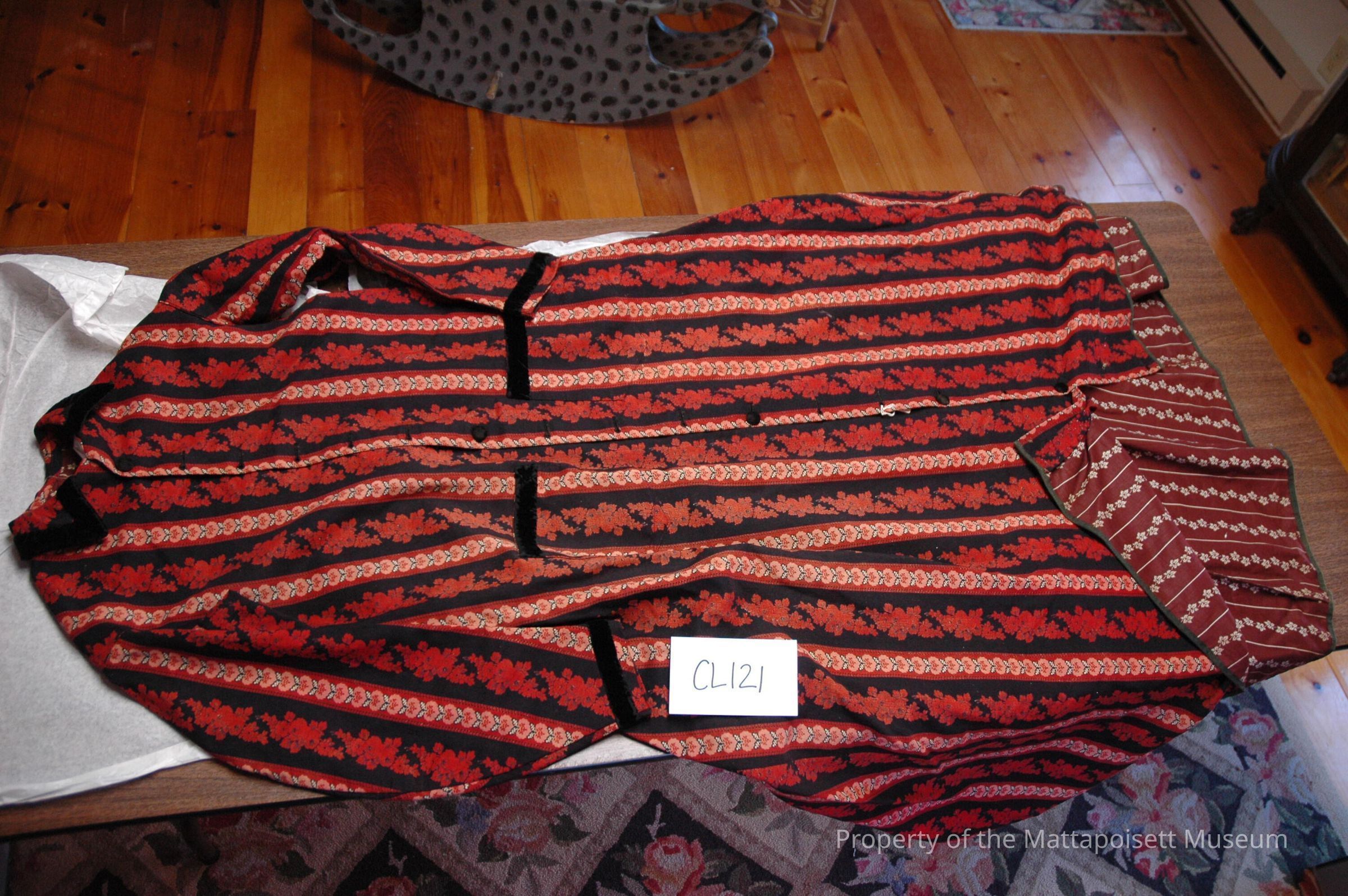 Notes: Notecard: Old-fashioned print robe. Woven cotton, floral and heart shape, leaf-stripe, multi-print lining, velvet trim.Created By