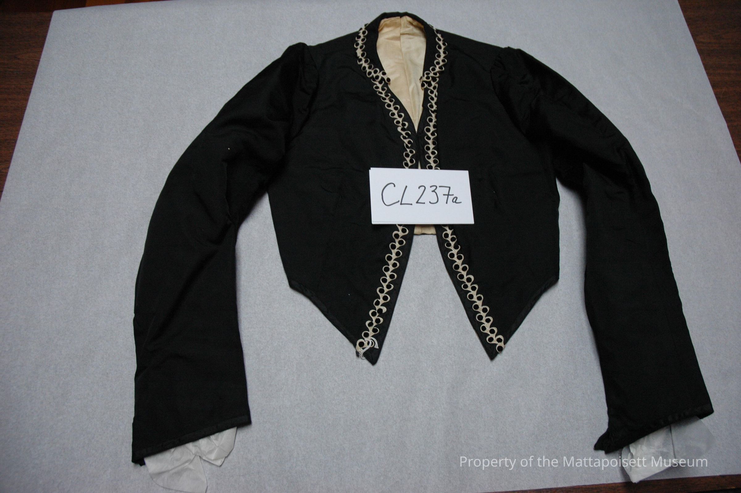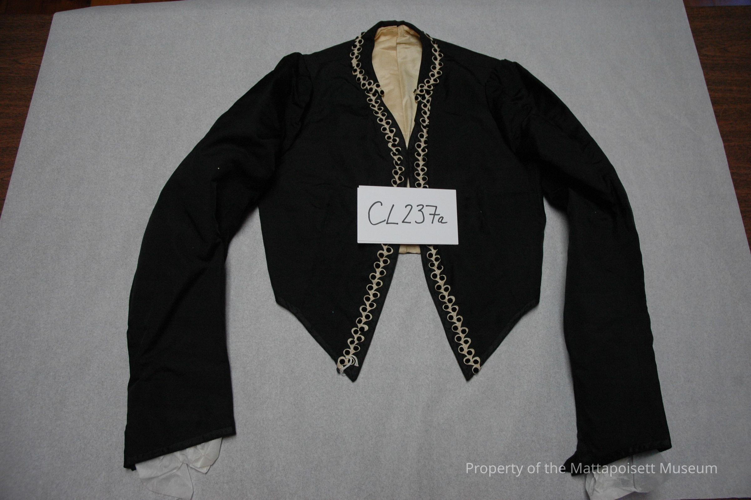 Notes: Notecard: 2-piece black gown waist trimmed with white braid with black dots. No skirt information. (Old description) Black silk waist with beige & black velvet trim; sleeves trimmed in satin.Created By