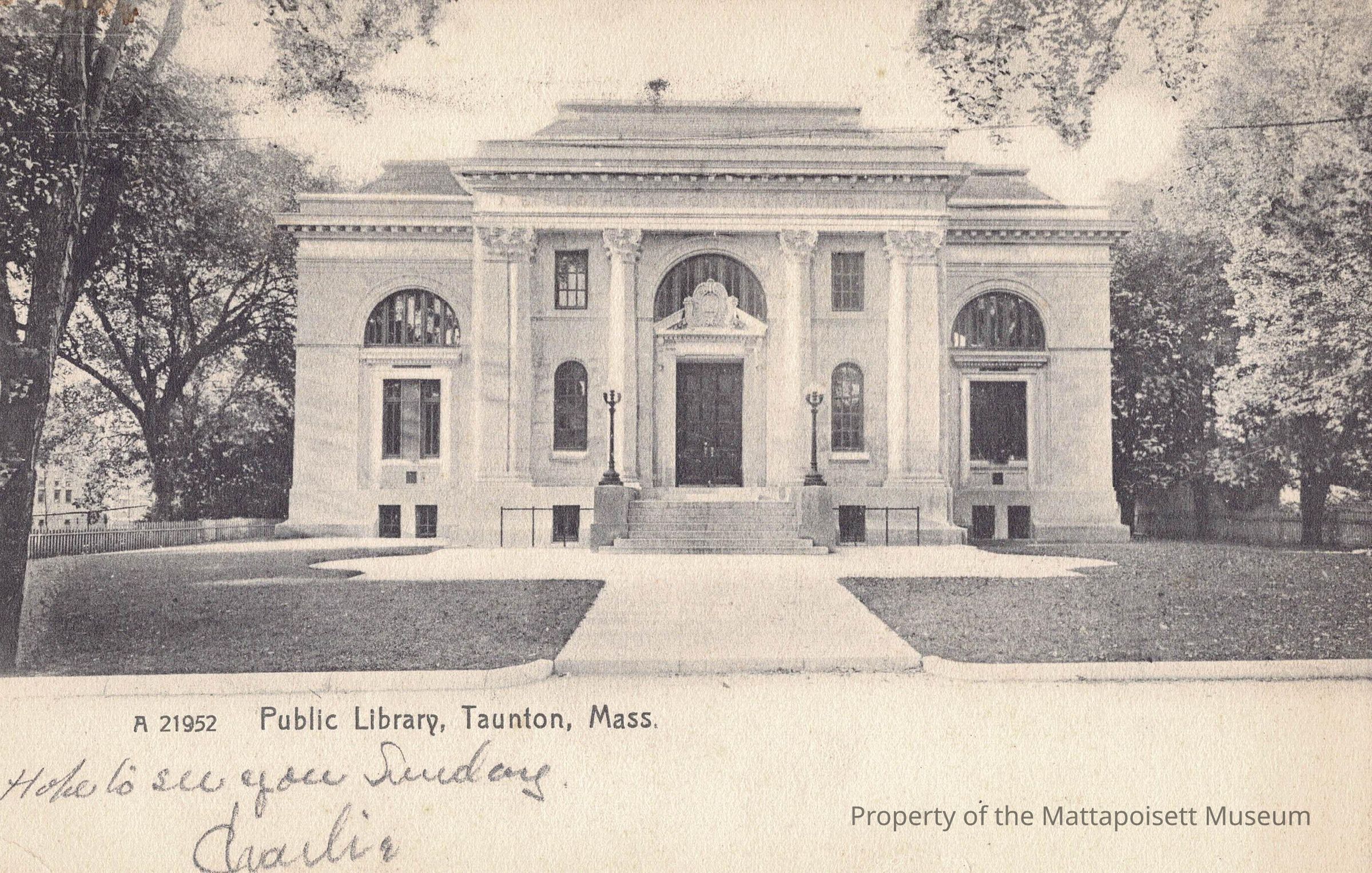 Black and white postcard showing Public Library, Taunton, Mass. Handwritten note to Mrs. George Purrington, Mattapoisett, Massachusetts. Postmarked from Taunton, Massachusetts on July (date not legible), 1912.Collection