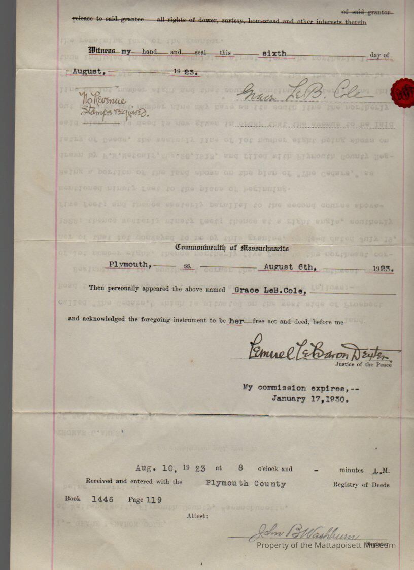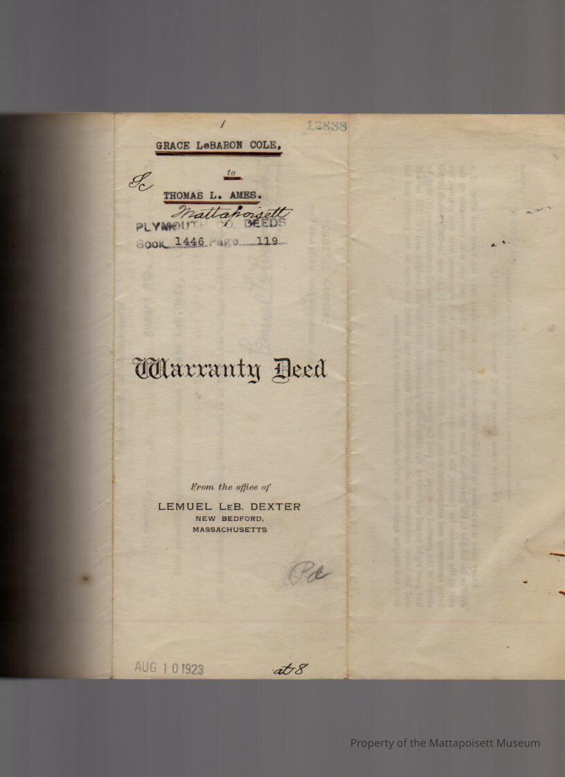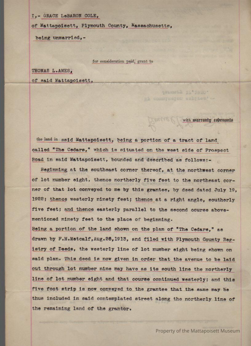 Grace LeBaron Cole to Thomas L. Ames, land called "The Cedars" on the west side of Prospect Street.Collection