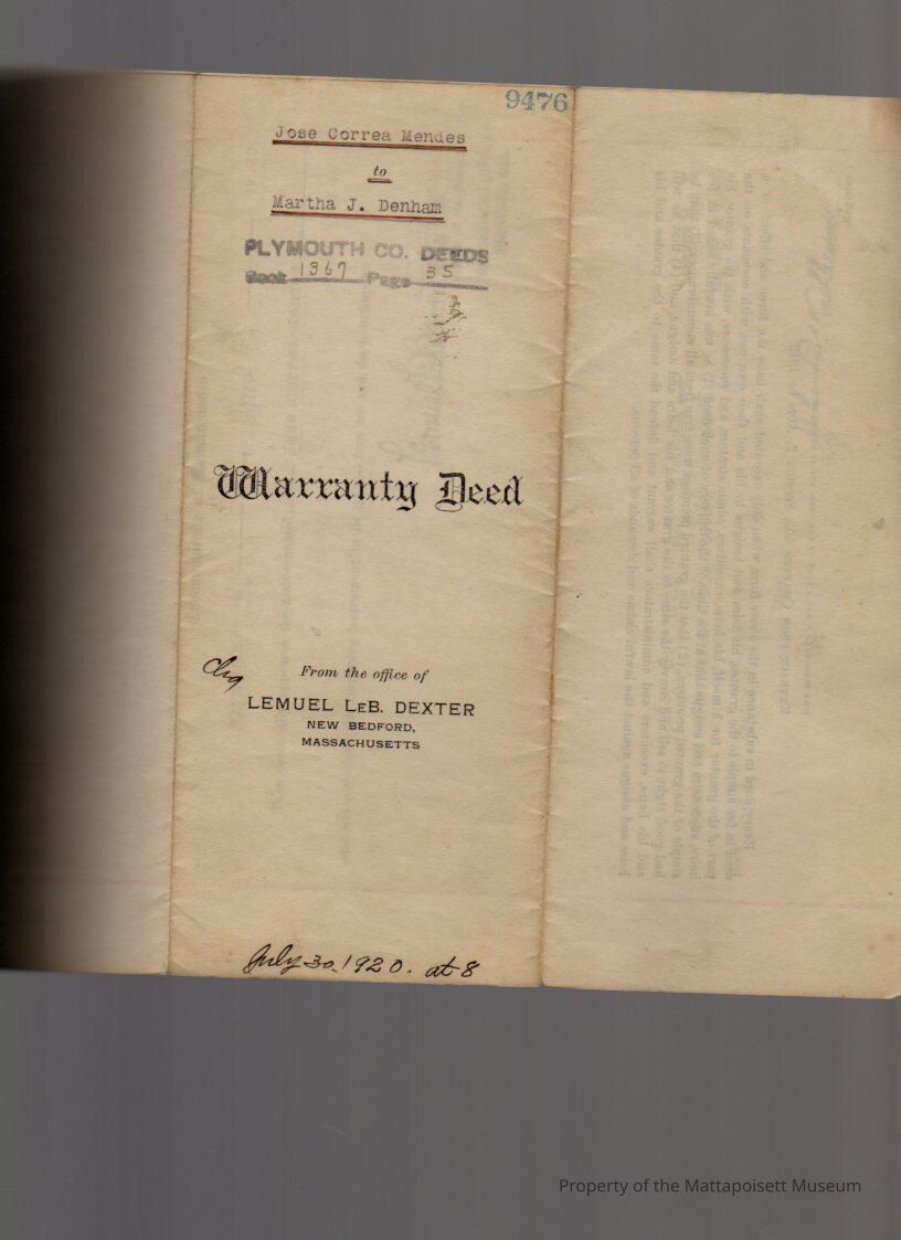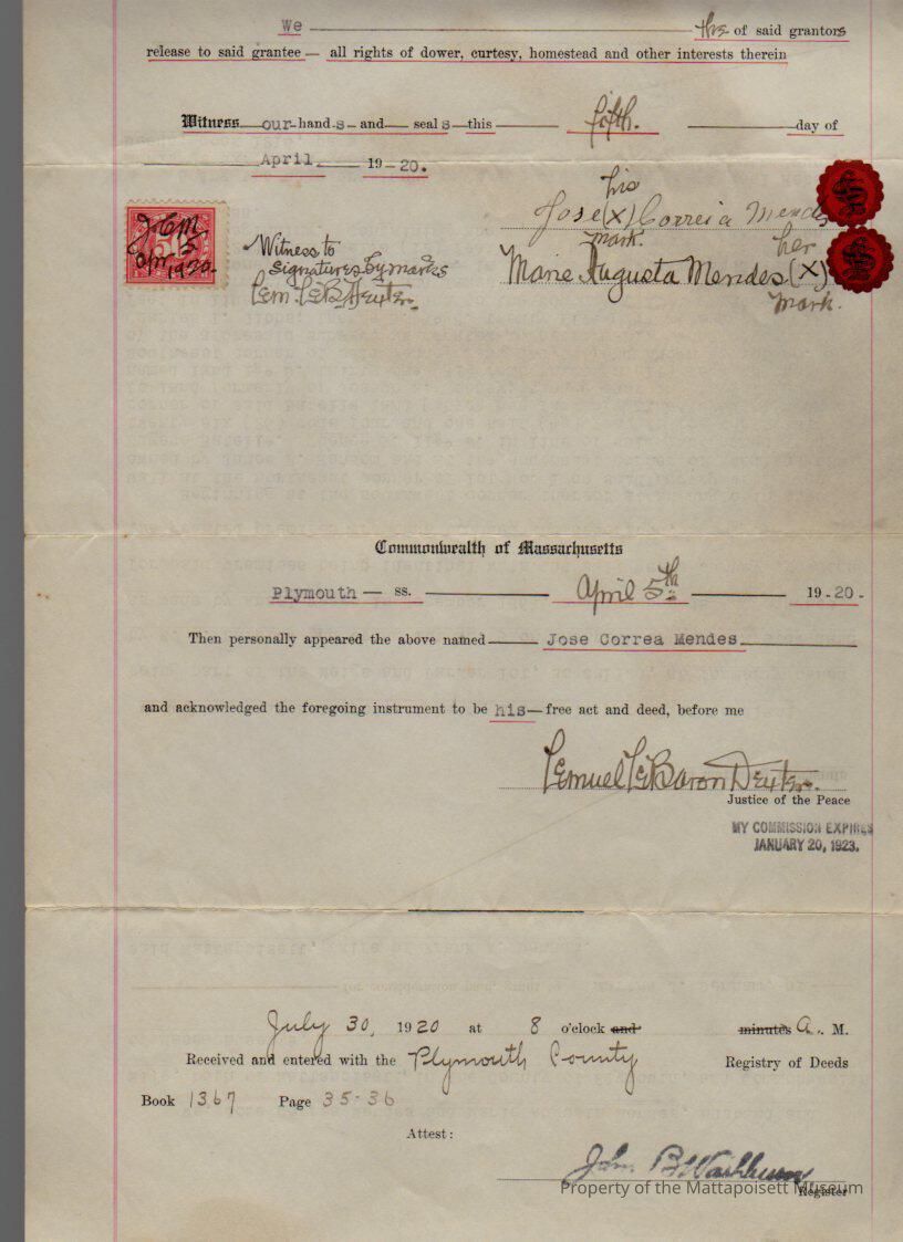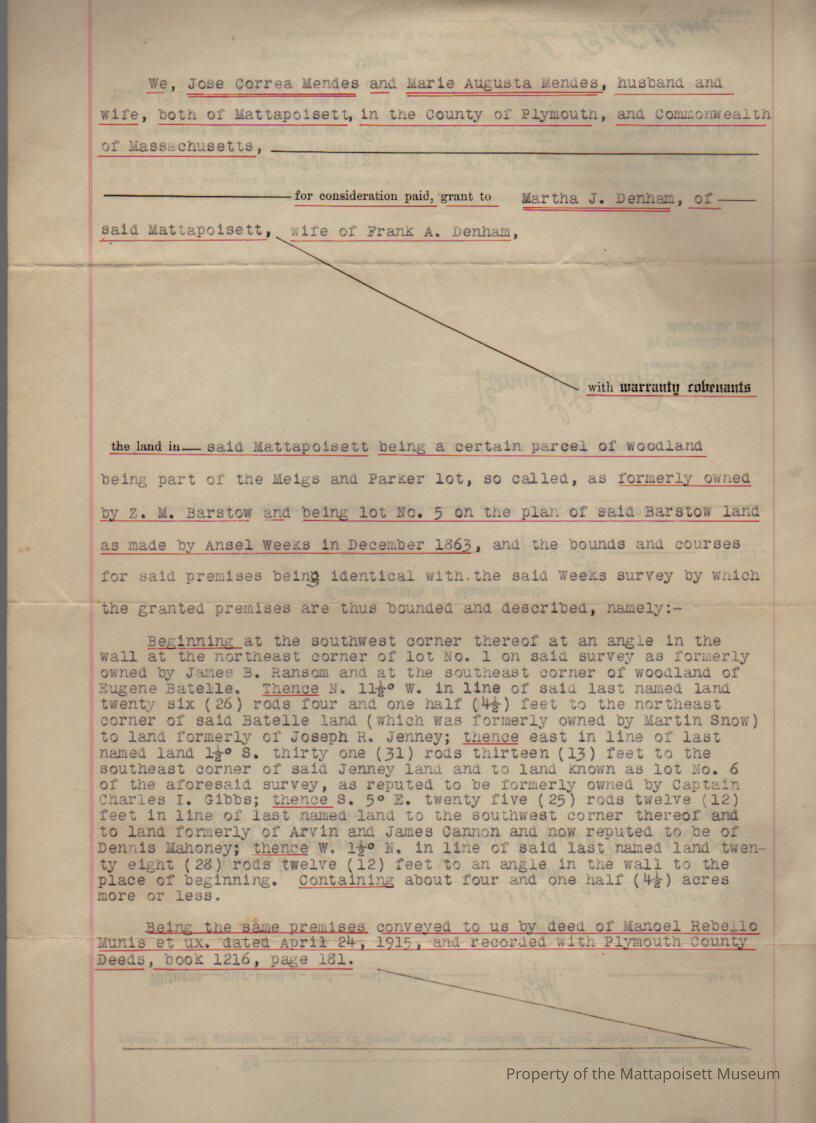 Jose Correa & Marie Augusta Mendes to Martha J. & Frank A. Denham, 4 1/2 acres woodland known as part of "Meigs and Parker Lot".Collection