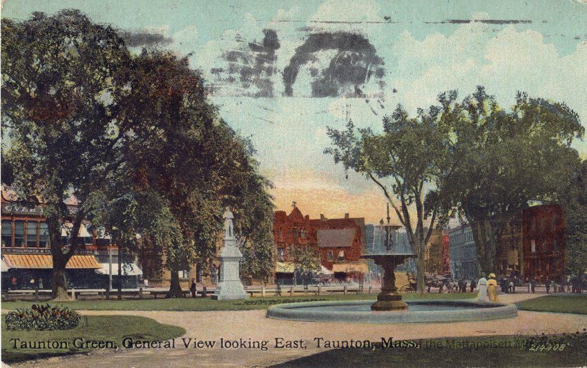 Hand-colored postcard showing Taunton Green, General View looking East, Taunton, Mass. Handwritten note to Mrs. George Purrington, Mattapoisett, Mass. Postmarked in Taunton, Massachusetts on March (date not legible), 1912.Collection