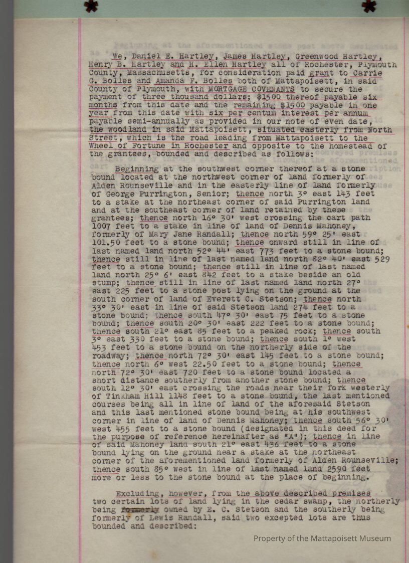 Daniel E. Hartley, James Hartley, Greenwood Hartley, Henry B. Hartley and H. Ellen Hartley of Rochester to Carrie G. Bolles and Amanda F. Bolles, mortgage of $3,000, paid over 1 year, land easterly of North Street.Collection