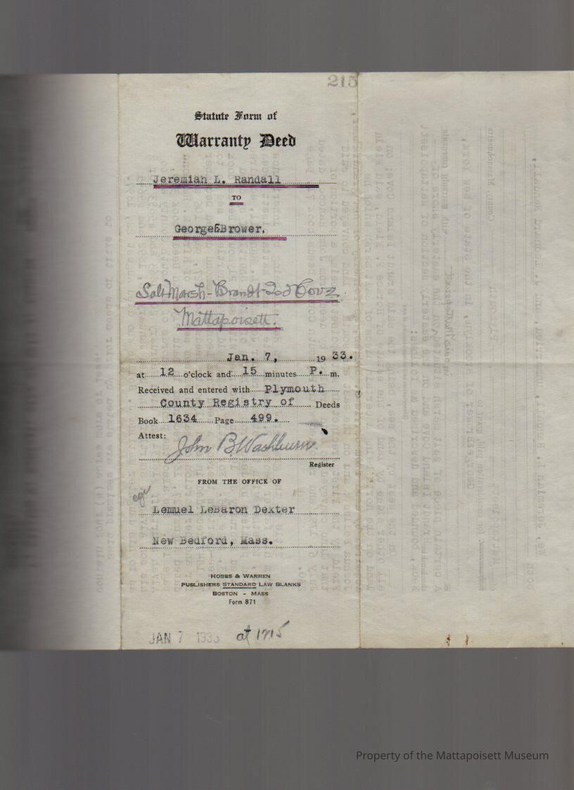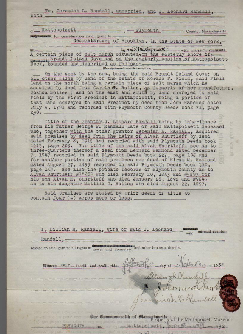 Jeremiah L. Randall and J. Leonard & Lillian M. Randall to George E. Brower of Brooklyn, 4 acres salt marsh on the east shore of Brandt Island Cove on the east section of Mattapoisett Neck.Collection