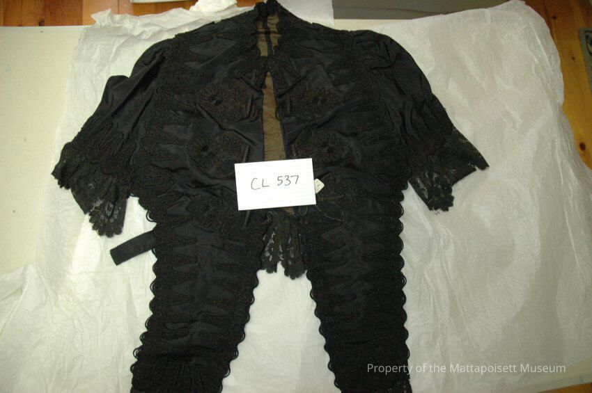 Notes: Notecard: Black silk taffeta cape, lace trim, long front panels and loops.Created By