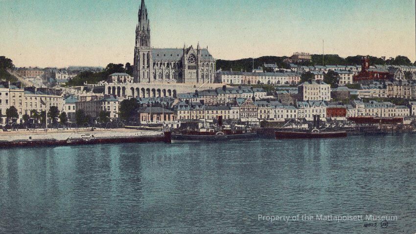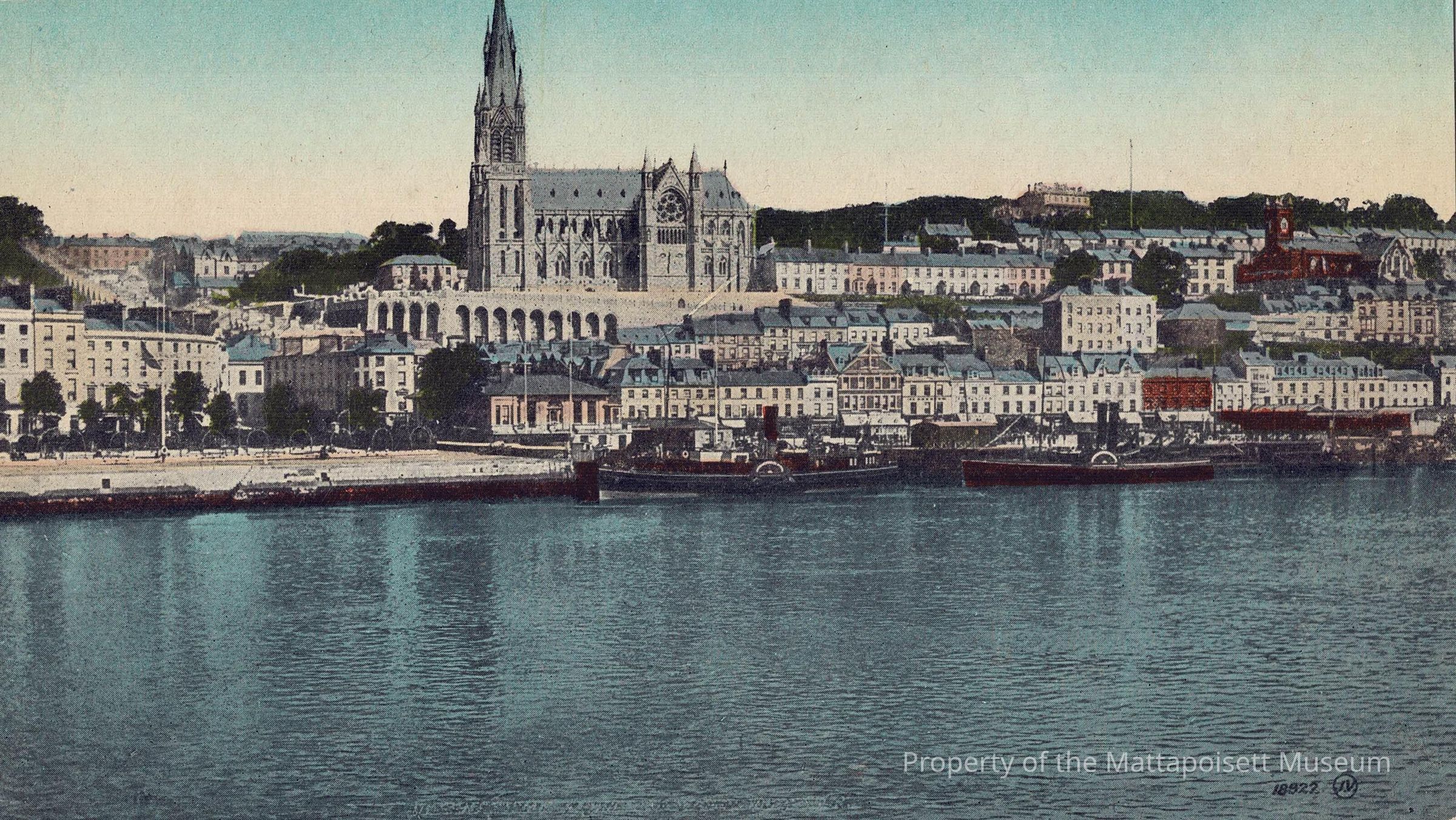 Hand-colored postcard showing a view of Queenstown (Cobh), Ireland. The content of the handwritten note states it is a view of the location of "US Navy Base Hospital #4, Base #6, European Waters". Note states: "Dear Jennie, This is a good view of the town where we are stationed. We are near ready to open our Hospital and after that shall be pretty busy as there is ample need for such an institution amoung our men here. Few in America realize the importance of this Base. Love to your mother and all the family, Sincerely, Roland Harimann."Collection