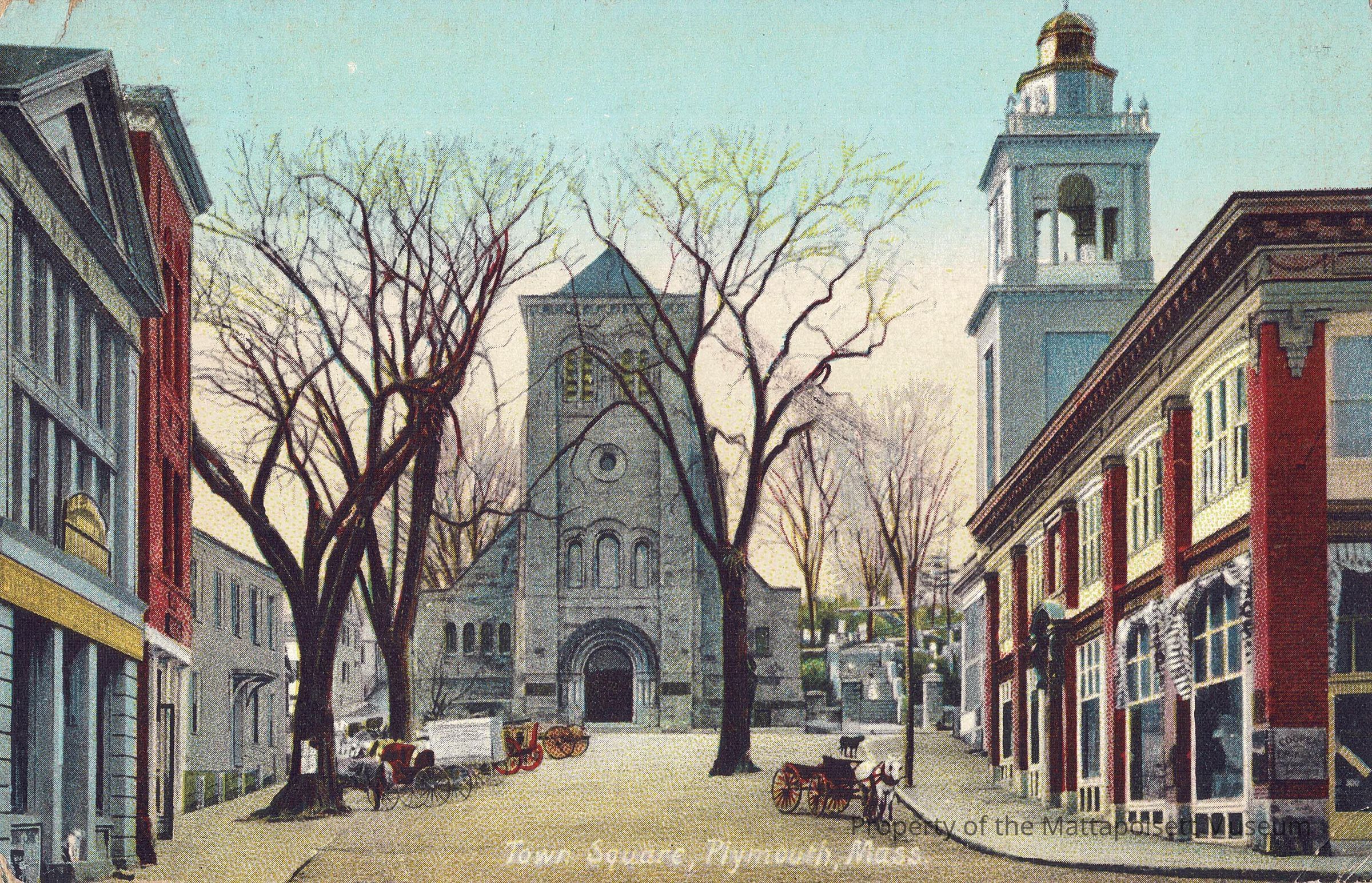 Hand-colored postcard showing Town Square, Plymouth, Mass. Handwritten note from Aunt Sarah to Mrs. Olivia H. Purrington, Mattapoisett, Massachusetts. Postmarked from Plymouth, Mass. on August 24, 1908.Collection