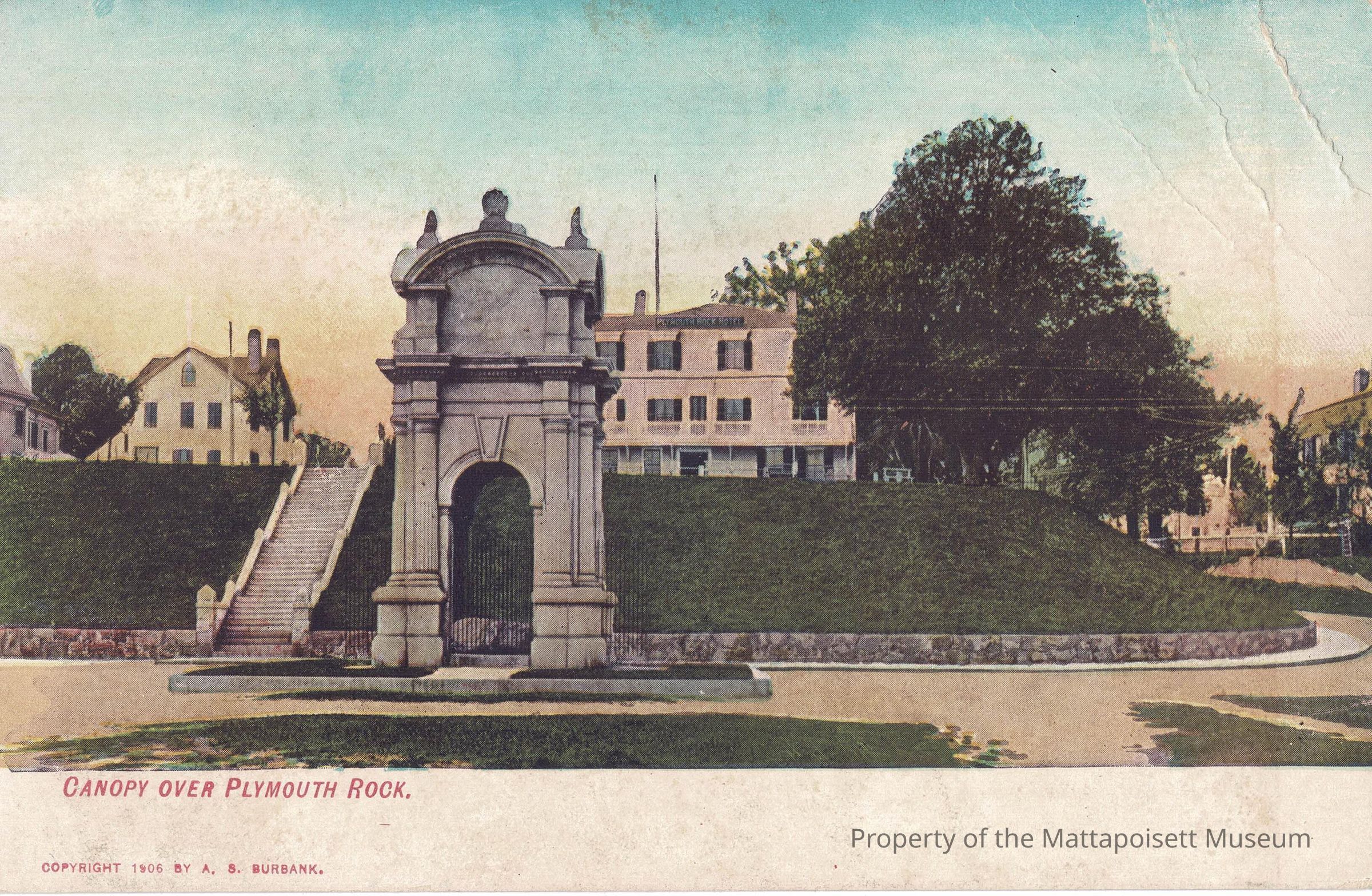 Hand-colored postcard showing Canopy over Plymouth Rock..Collection