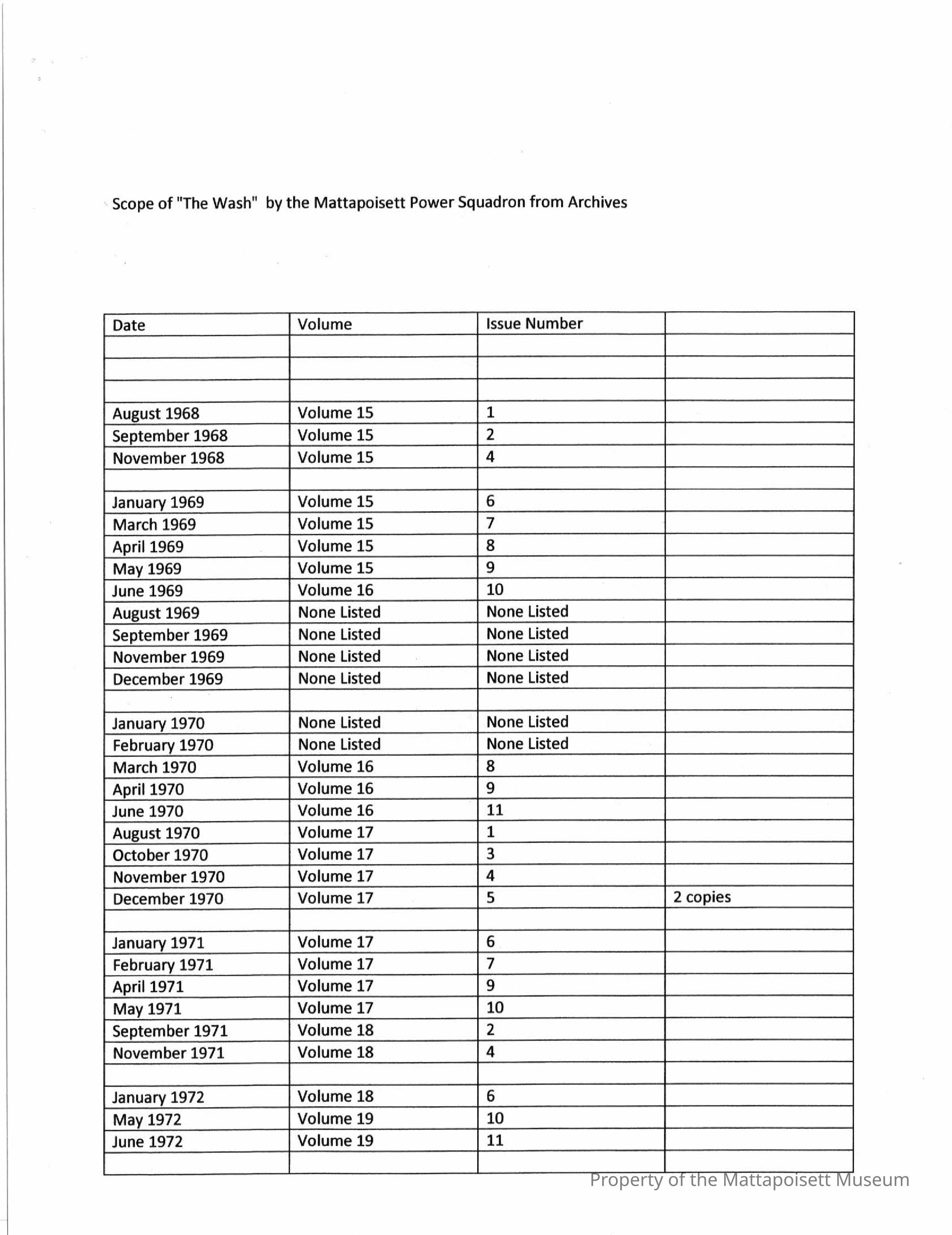 A collection of newsletters published by the Mattapoisett Power Squadron, c. 1968-1979. Reports on activities of the organization, publicizes upcoming events, and also has advertisements for local businesses and occasionally people buying or selling boats.Collection