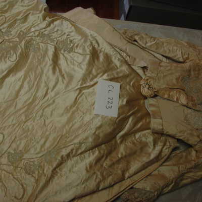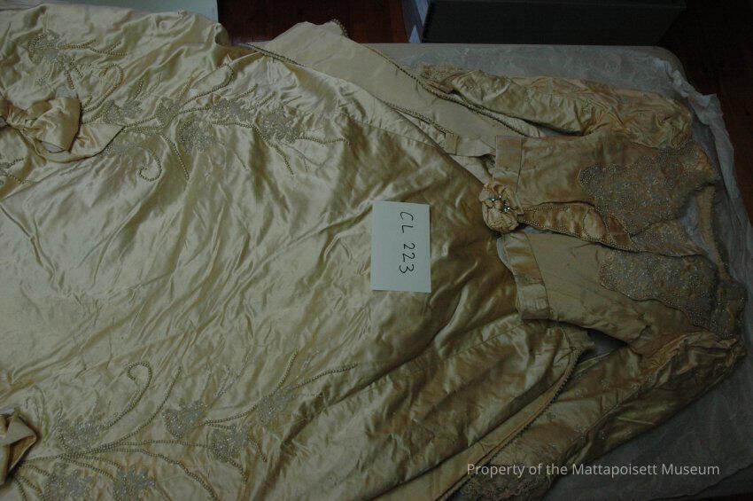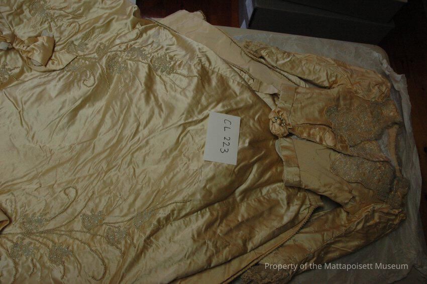 Ecru two-piece silk taffeta wedding dress, heavy seed pearls and crystal decoration on bodice & sleeves. skirt has row of seed pearls & crystals down each side.Collection