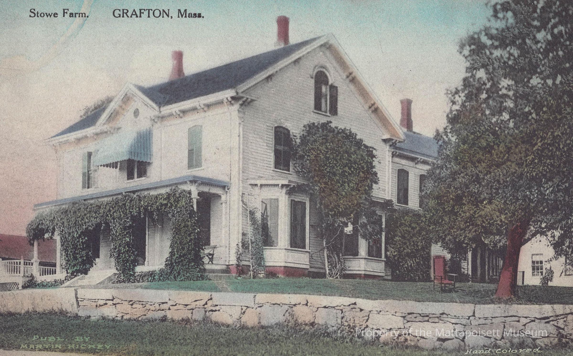 Hand-colored postcard showing Stowe Farm, Grafton, Mass. Handwritten note to Mrs. George Purrington, Mattapoisett, Mass. Postmarked from Grafton, Mass. on June (date not legible), 1912.Collection