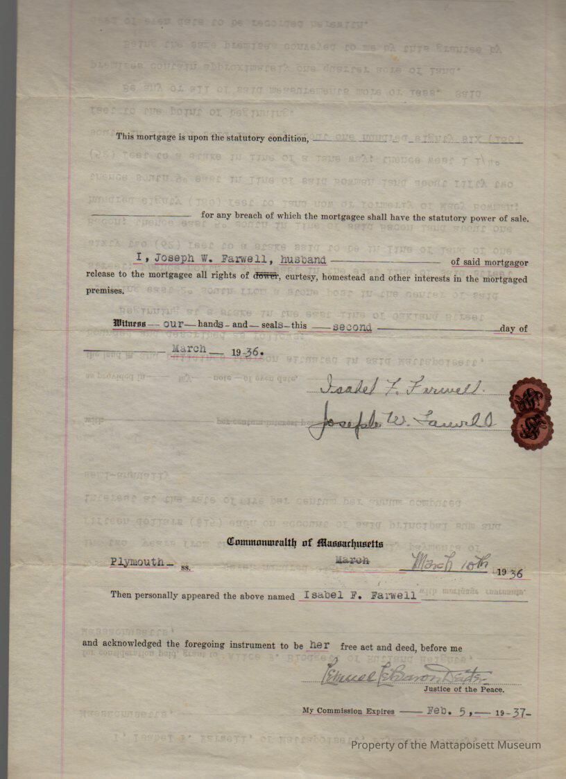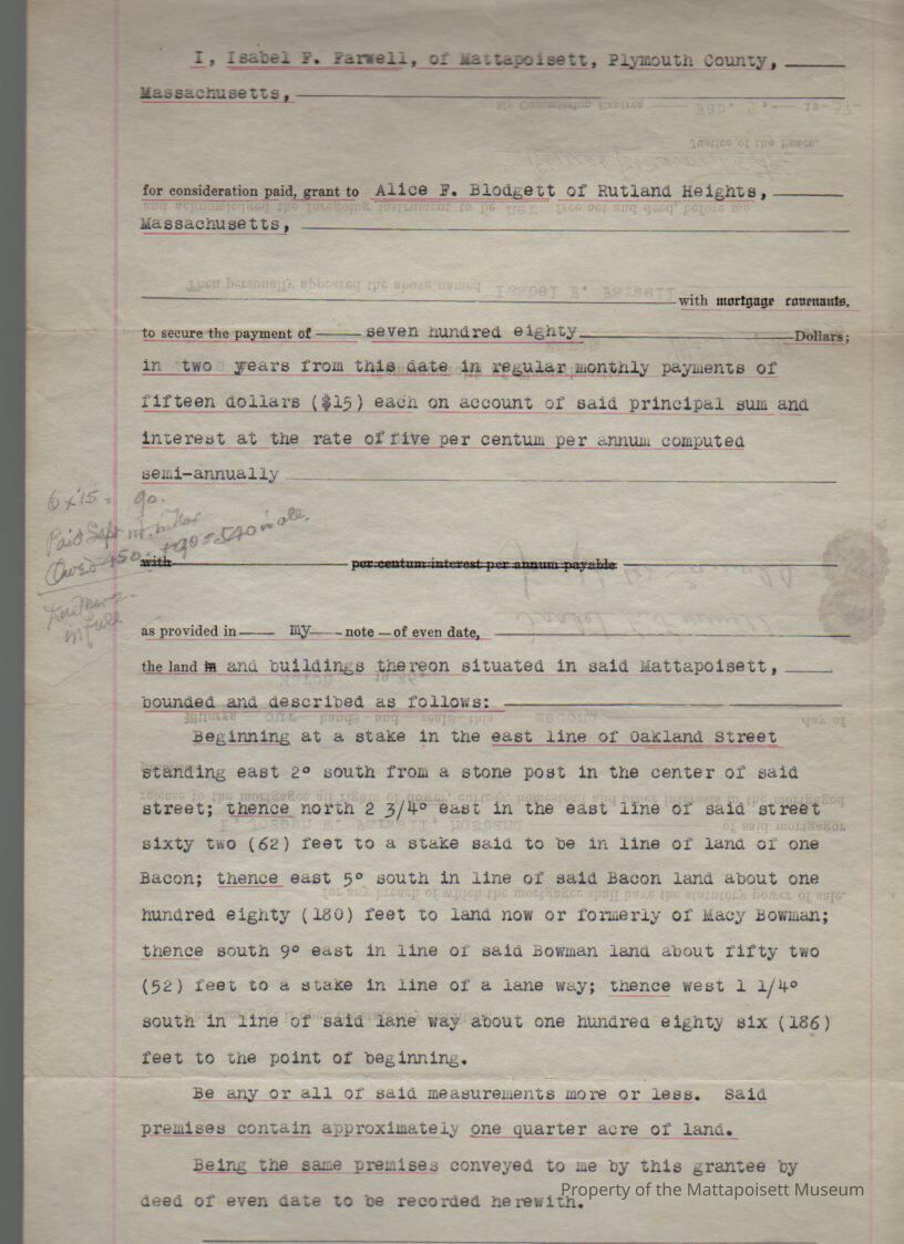 Isabel F. & Joseph W. Farwell to Alice F. Blodgett of Rutland Heights, 1/4 acres land and buildings on the east side of Oakland Street for $780 over 2 years.Collection