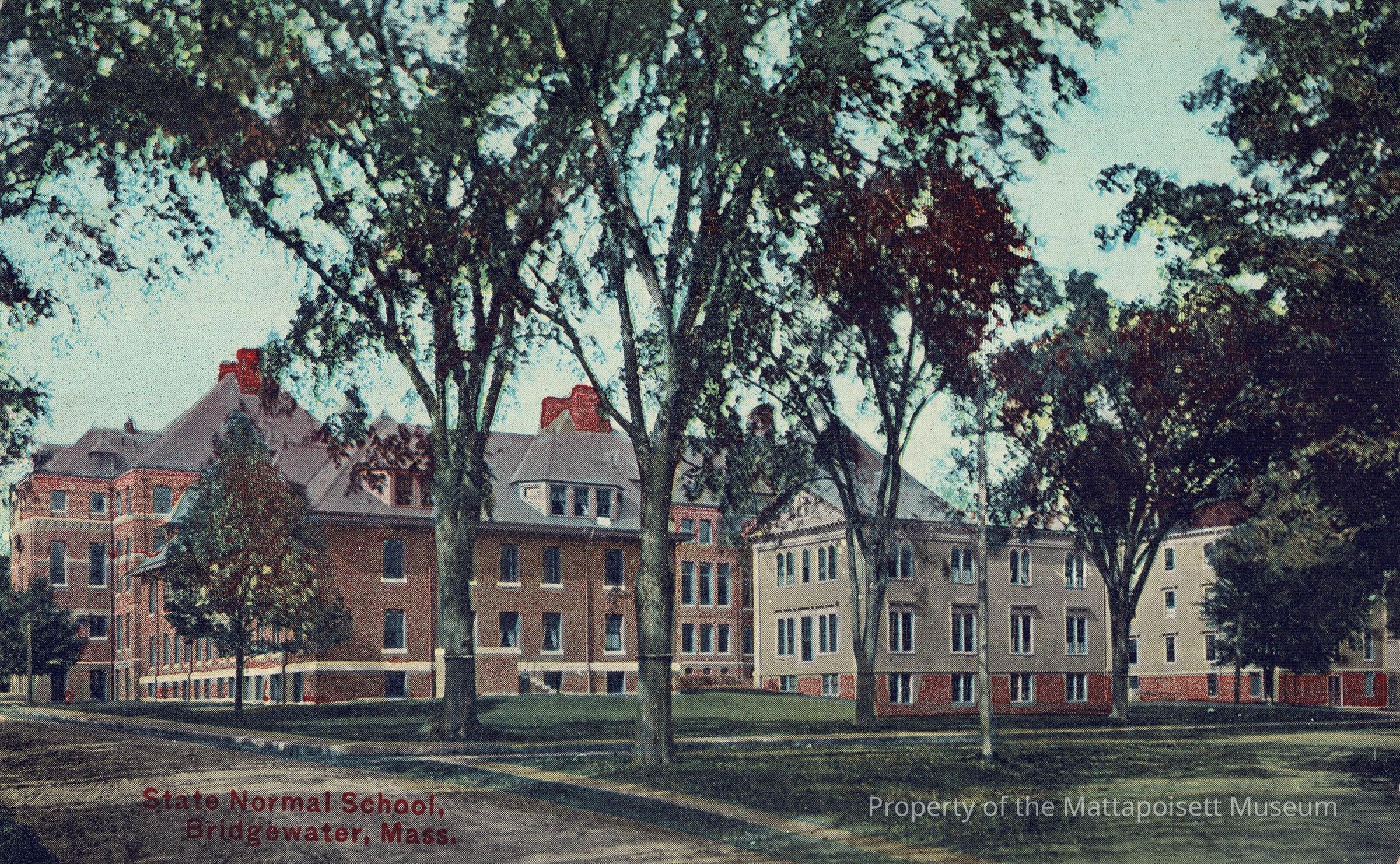 Hand-colored postcard showing State Normal School, Bridgewater, Mass. Handwritten note to Mrs. George Purrington, Jr., Mattapoisett, Mass. Postmarked from Bridgewater, Mass. on August (date not legible), 1910.Collection