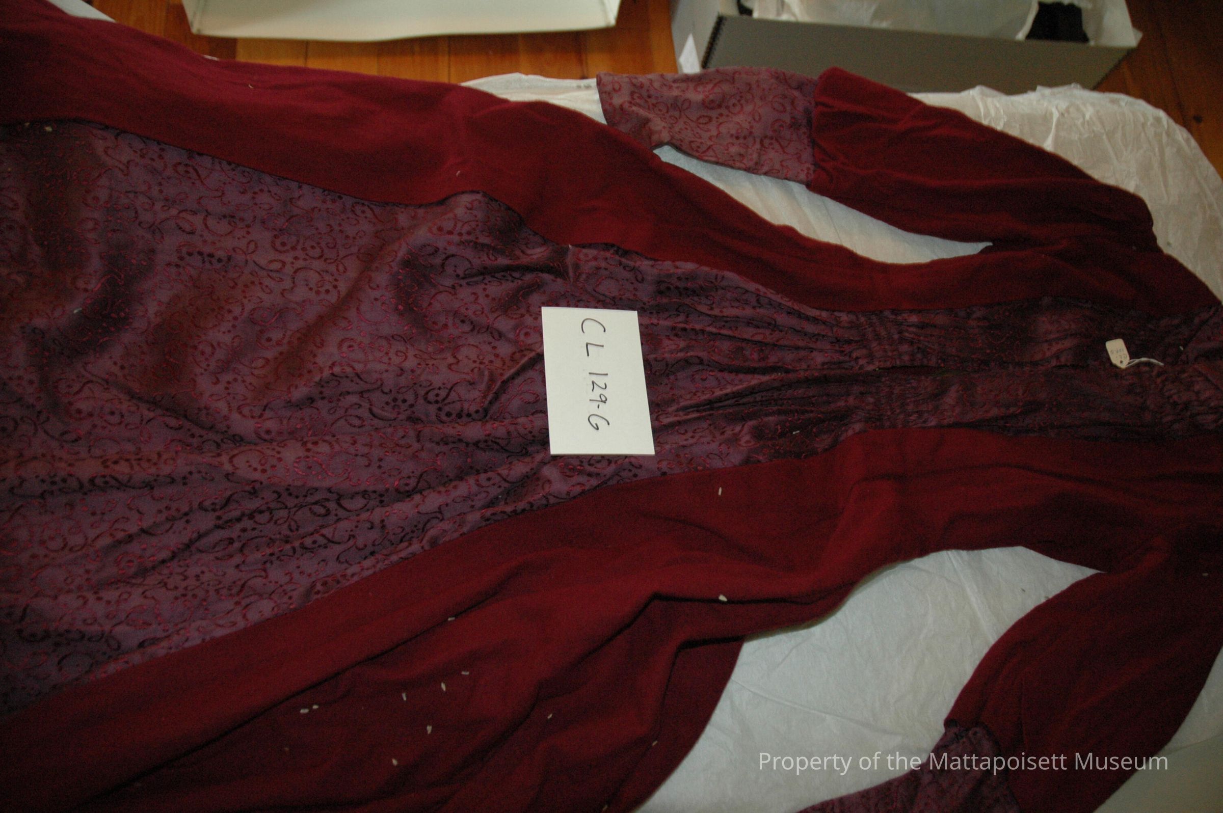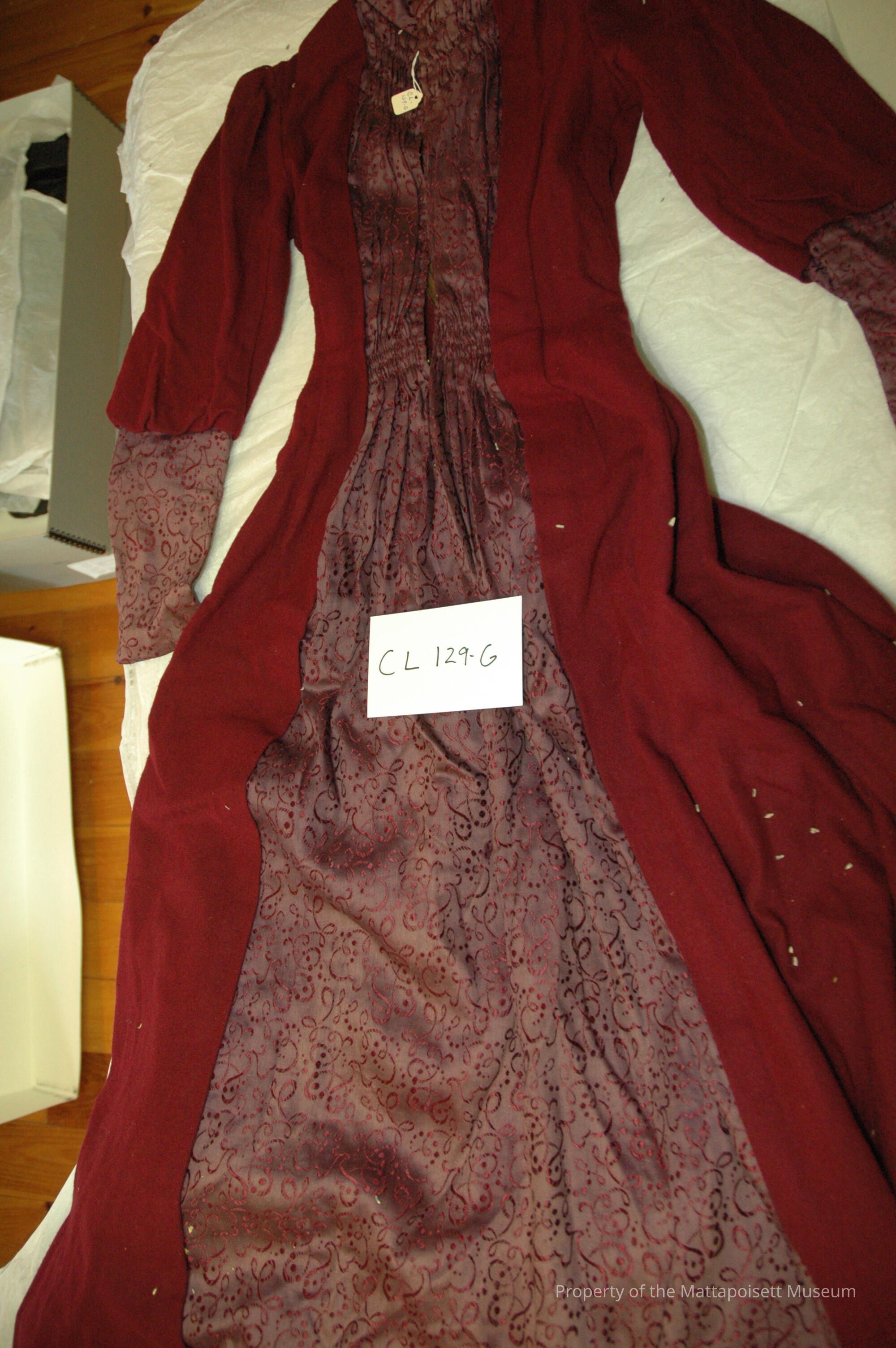 Notes: Notecard: Red wool house gown. Dark red gown opening down front with brocaded silk inset and long sleeves.