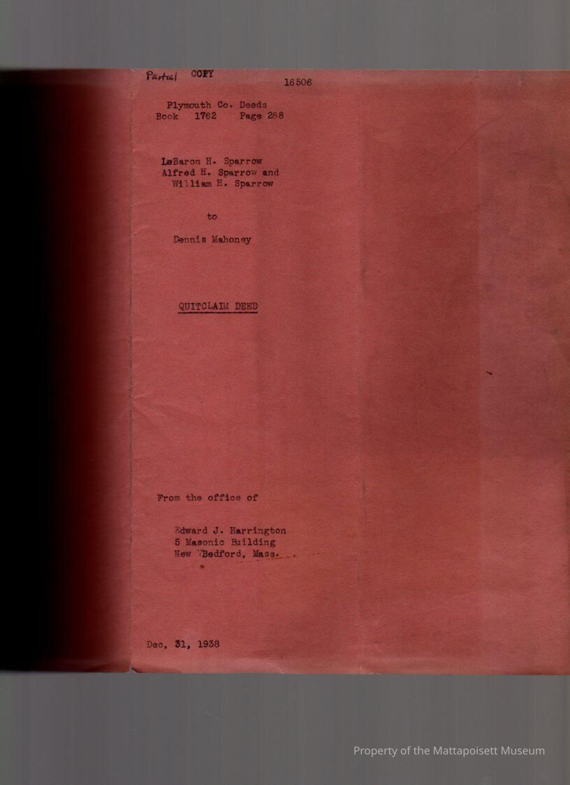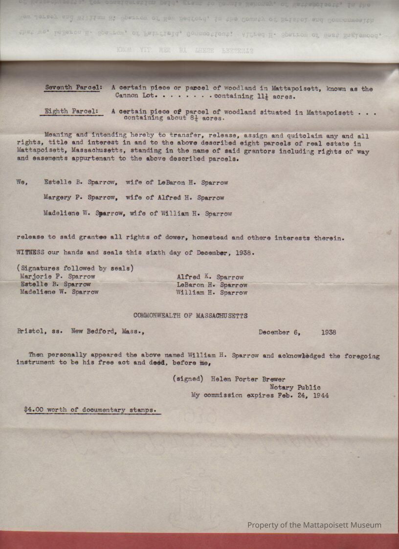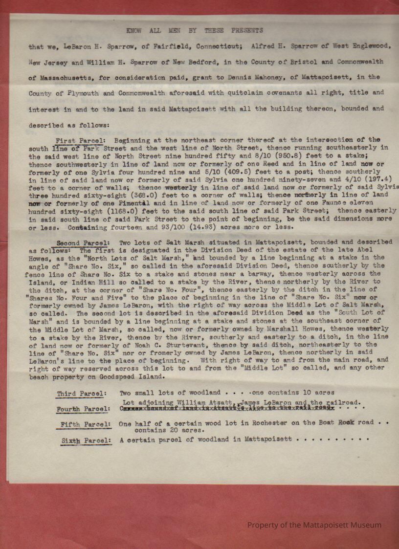 LeBaron H. & Estelle B. Sparrow, Alfred H. & Margery P. Sparrow and William H. & Madeliene W. Sparrow to Dennis Mahoney, eight parcels of land in Mattapoisett. Copy.Collection