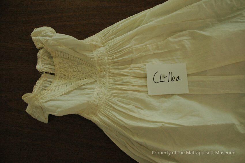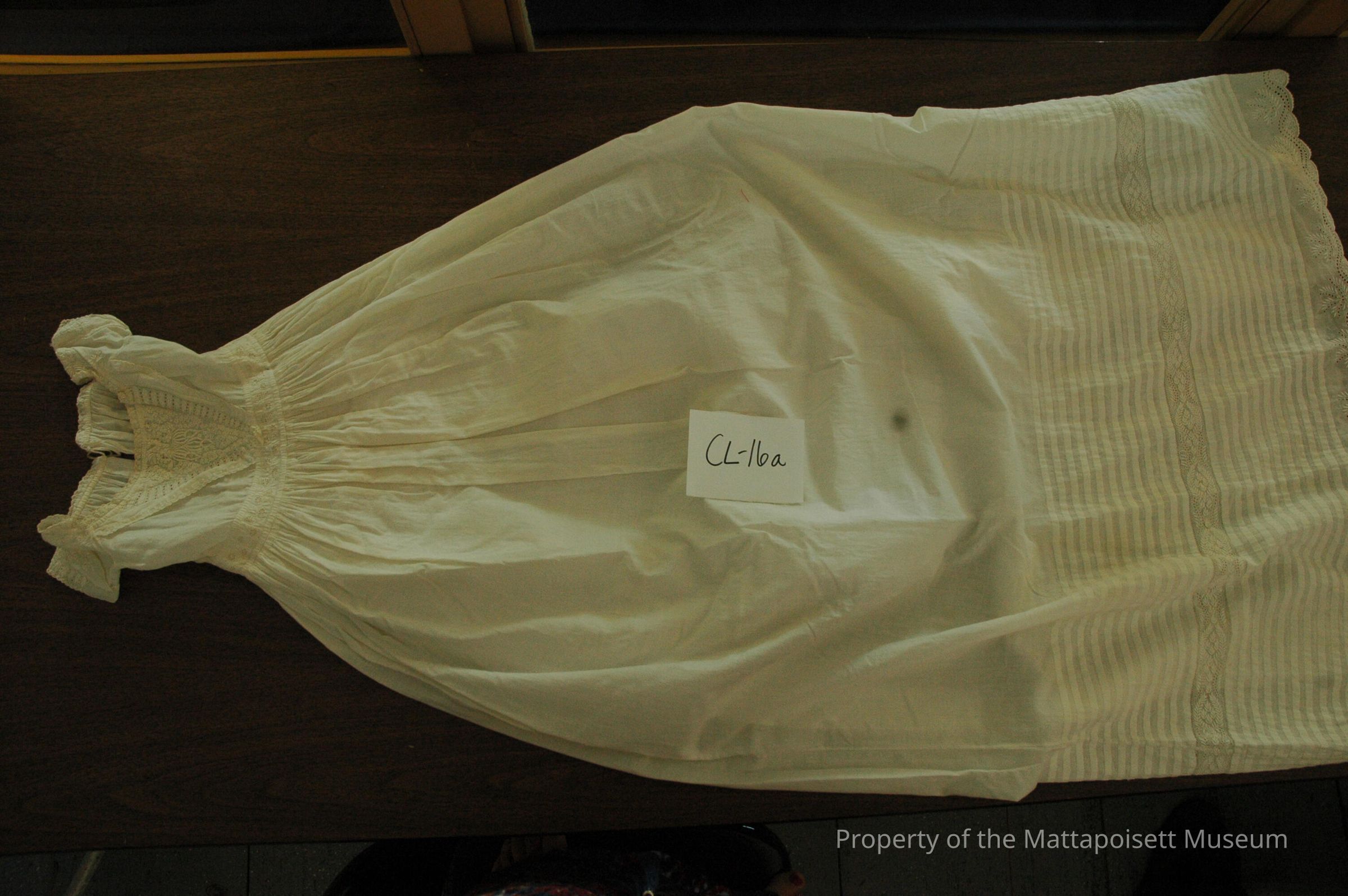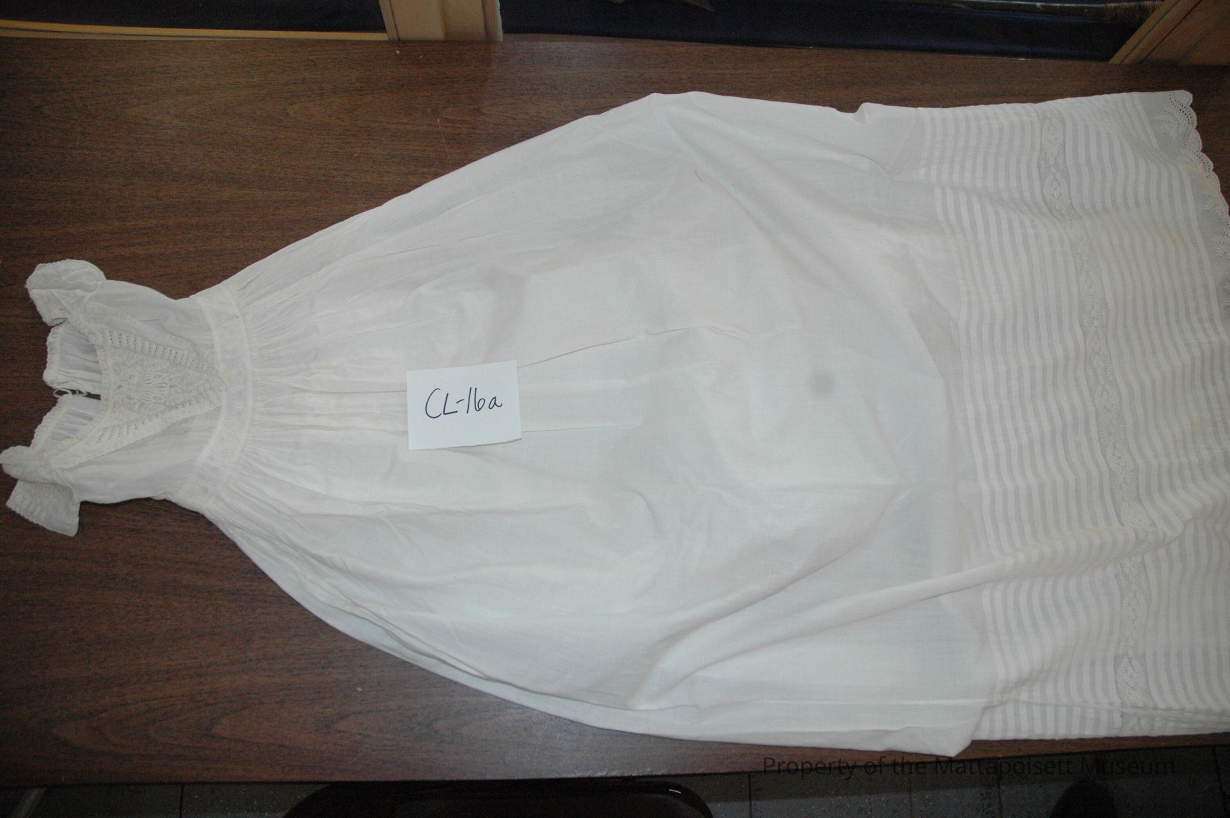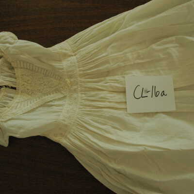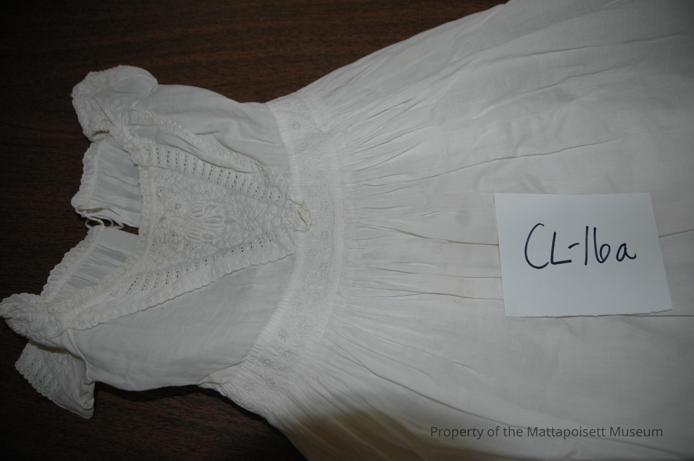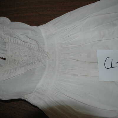 White christening dress, long white with heavy pleating and crocheted trim. V-neck embroideredy on front, embroidery on waist and sleeves, pleated lower 1/3 on skirt. Embroidered scalloped hem.Collection