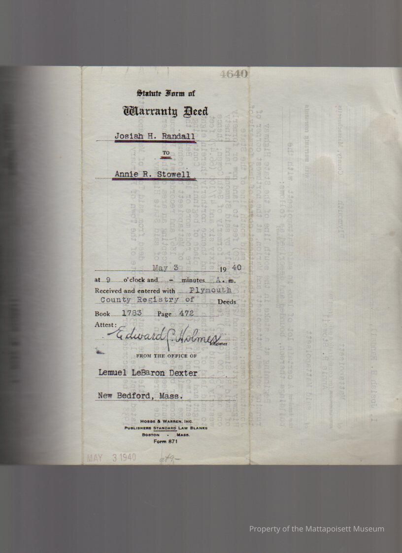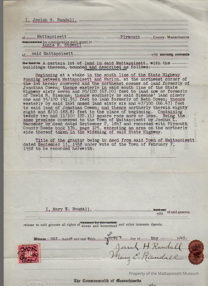 Josiah H. & Mary E. Randall to Annie R. Stowell, 22.11 sq. rods of land and buildings in Mattapoisett.Collection