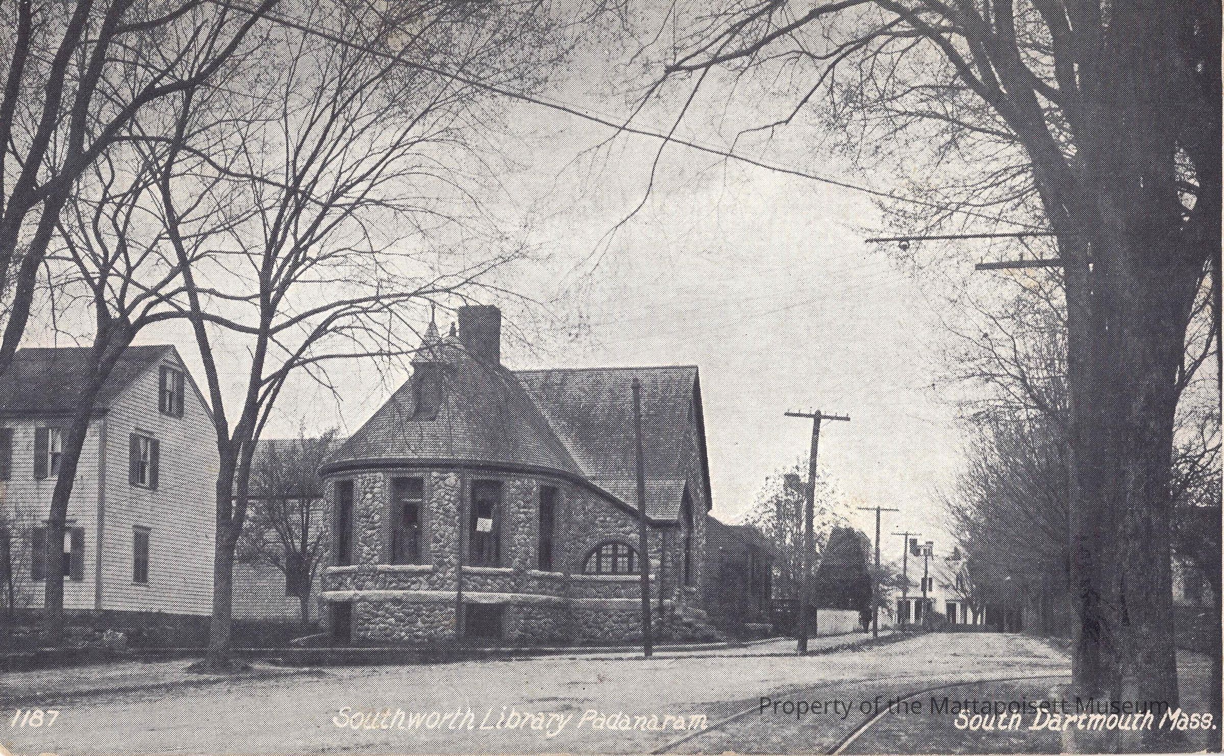 Black and white postcard showing Suthworth Library Padanaram, South Dartmouth, Mass. Handwritten note to Mrs. Olivia Purrington, Mattapoisett, Massachusetts. Postmarked from South Dartmouth, Mass. on February 5, 1908 and received in Mattapoisett, Mass. on February 6, 1908.Collection