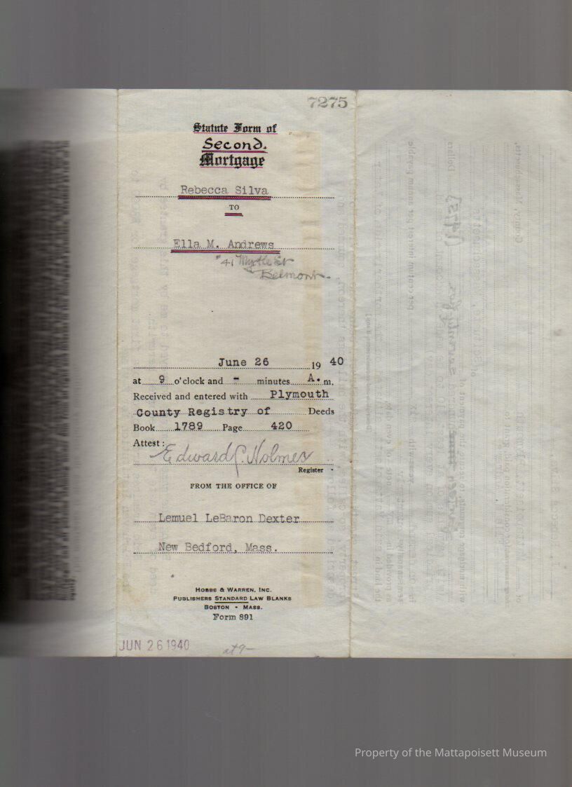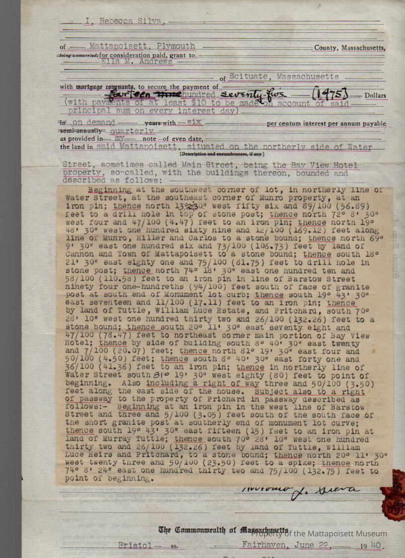 Rebecca & Antonio J. Silva to Ella M. Andrews, land on the north side of Water Street, being the Bay View Hotel property for $1,475 mortgage.Collection