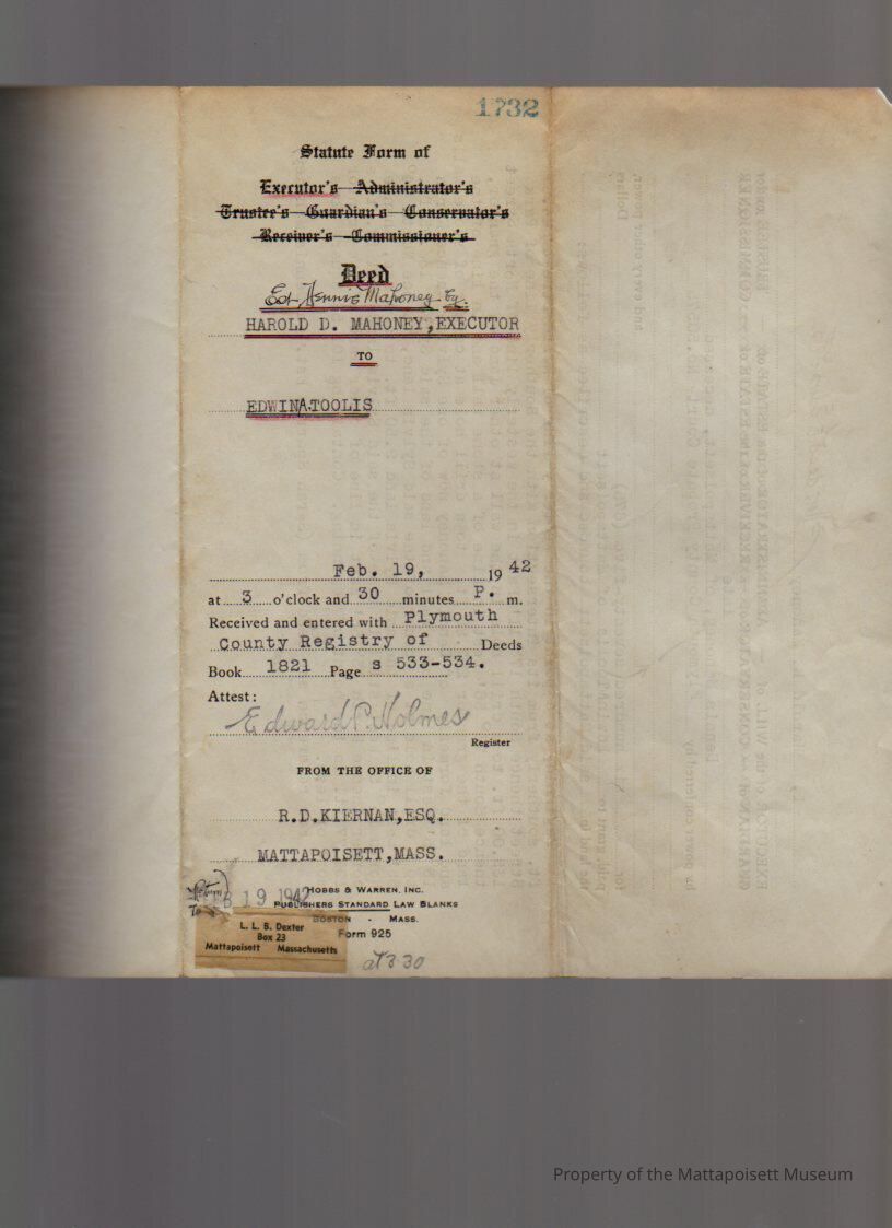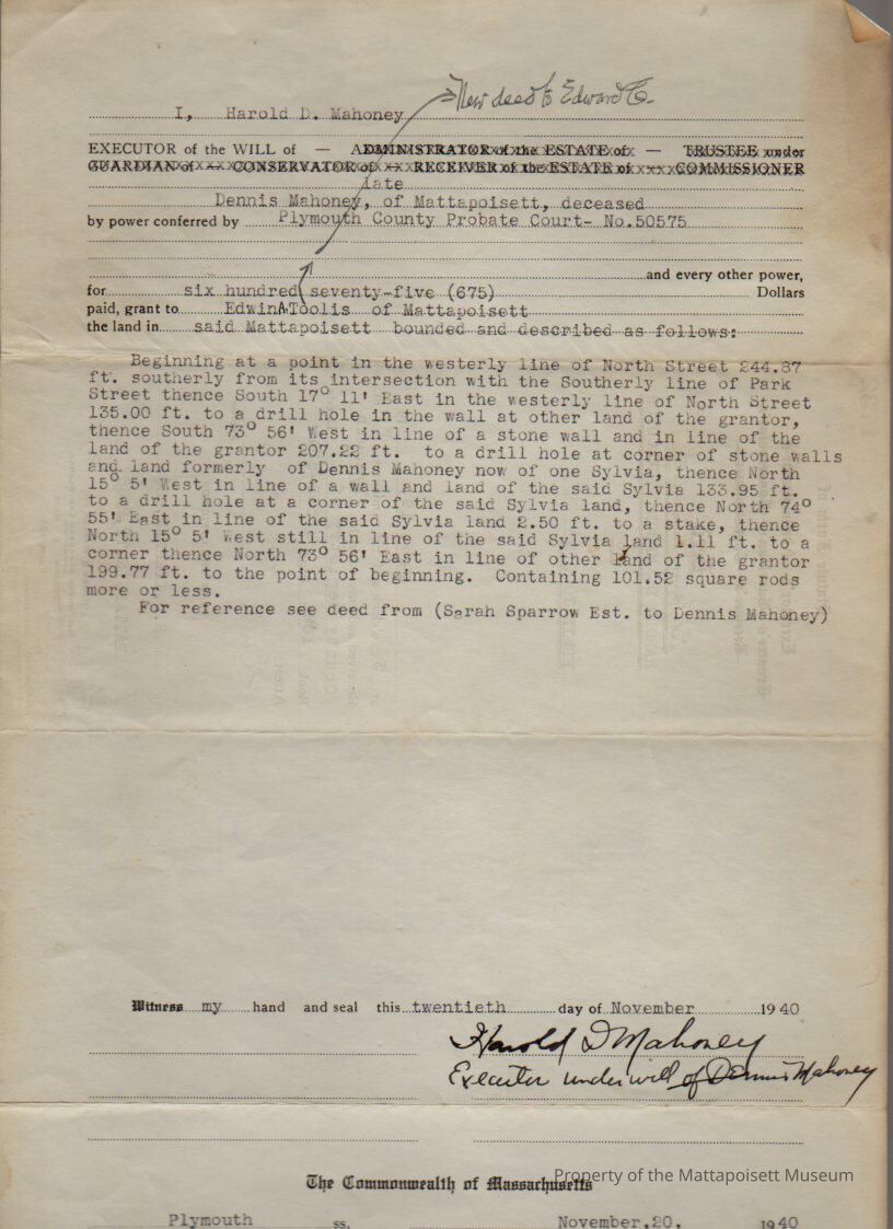 Harold D. Mahoney, executer under the will of Dennis Mahoney to Edwin A. Toolis, 101.52 sq. rods land east of North Street for $675.Collection