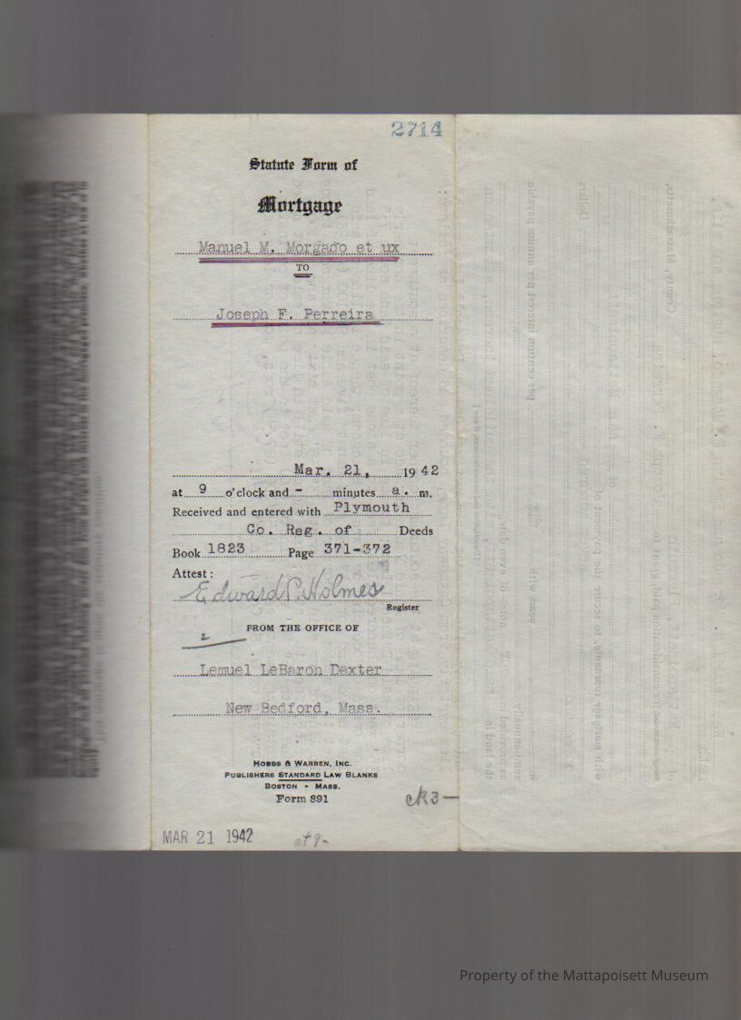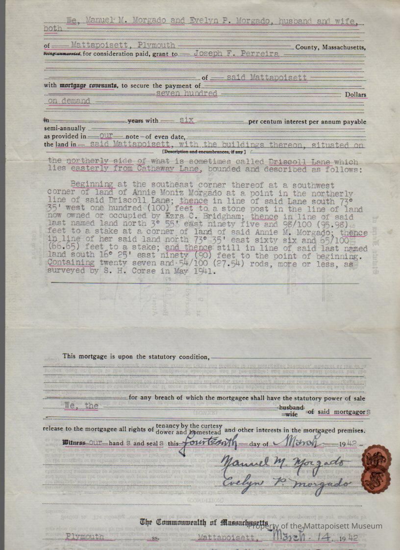 Manuel M. & Evelyn P. Morgado to Joseph F. Perreira, 27.54 rods (as surveyed by S. H. Corse) land and buildings on north side of Driscoll Lane which is east of Cathaway Lane for $700.Collection