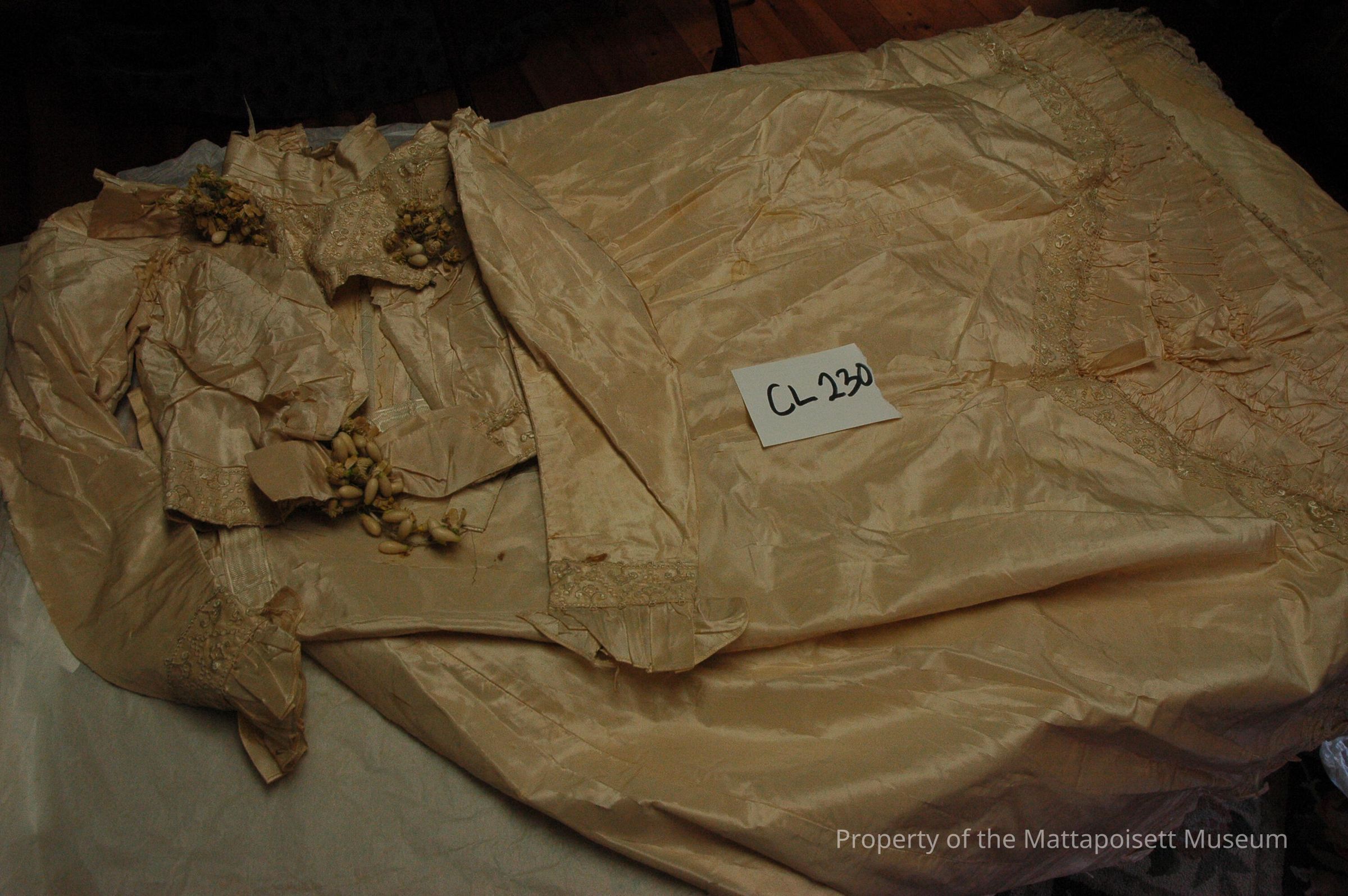 Notes: Notecard: Wedding dress (etc). Taffeta two-piece gown, lace trim train. White petticoat, kid slippers. Petticoat has two lace flounces. Framed wedding certificate (see P6) came with it. Donor requests if used, they be compainion pieces.